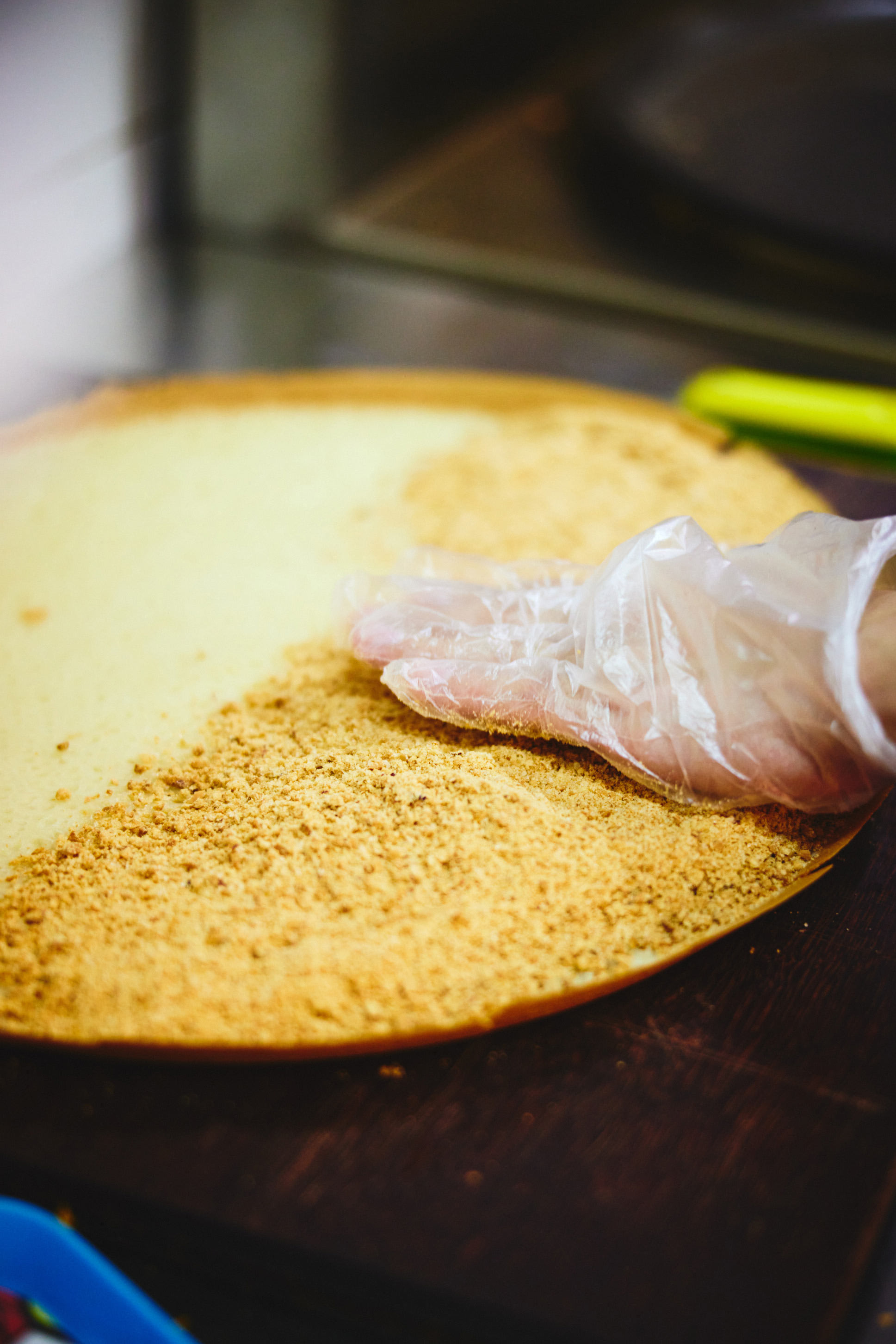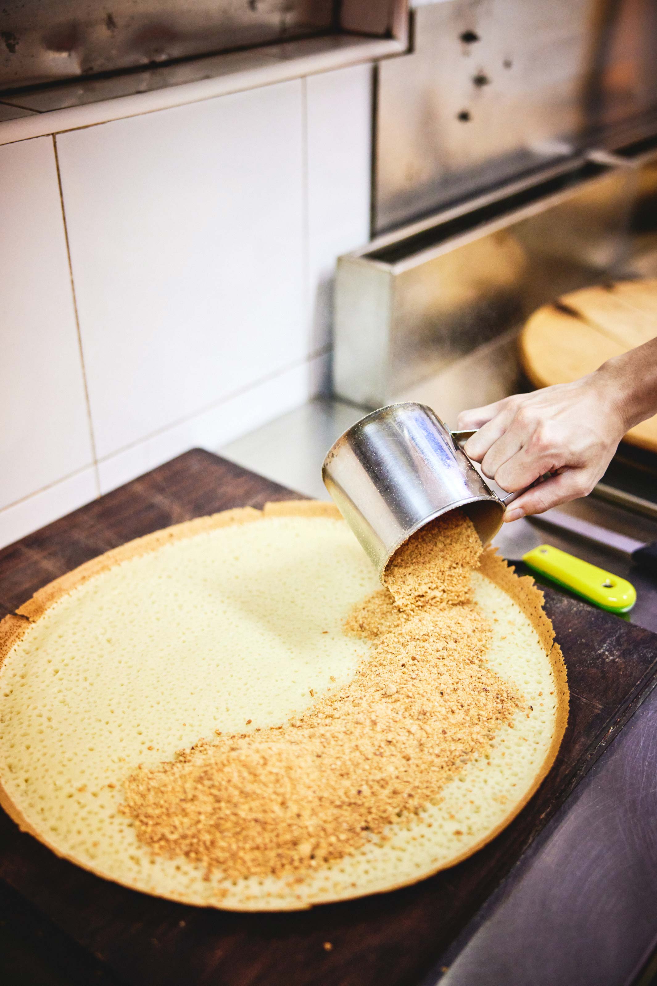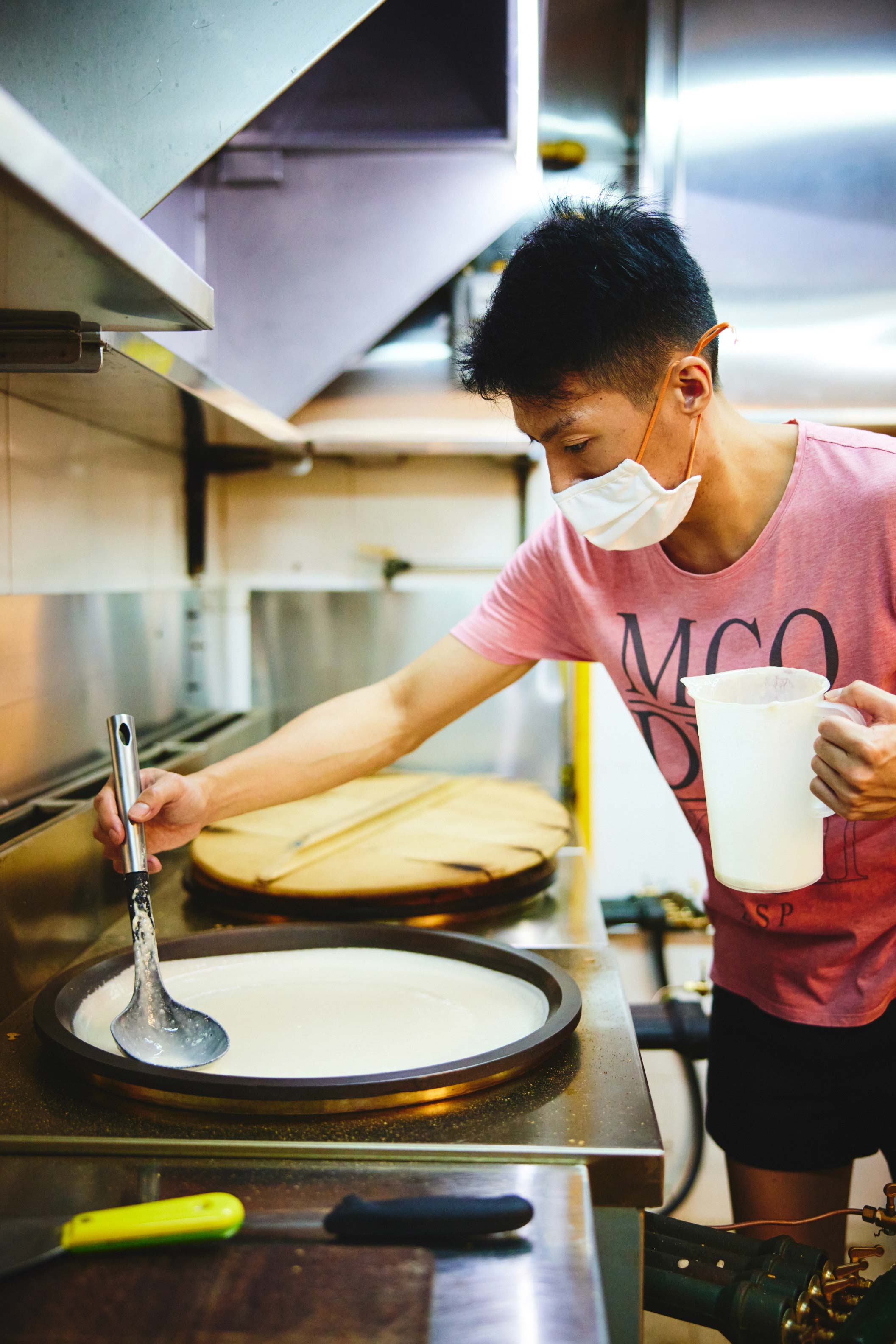 Thirty-year-old hawker Joseph is deft with his actions, spreading batter over three cast iron griddles simultaneously while preparing the fillings. He pauses to catch up with a regular customer while keeping an eye on the almost-ready min jiang kuehs. His multi-tasking ability reminds us of the popular console game, Overcooked. Any slip-up would mean starting over again and testing the patience of an already snaking queue. But he takes it in his stride, working with the precision of a true artisan.