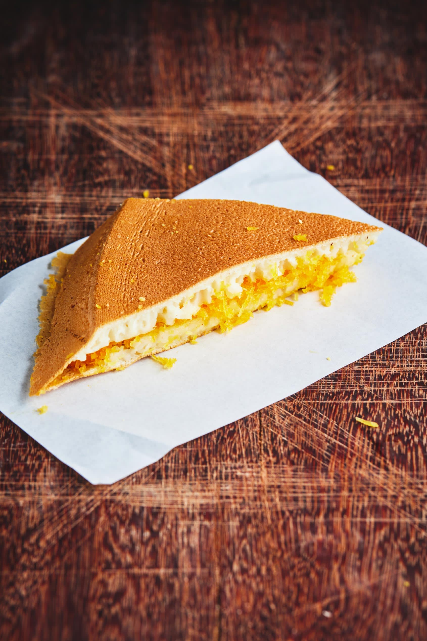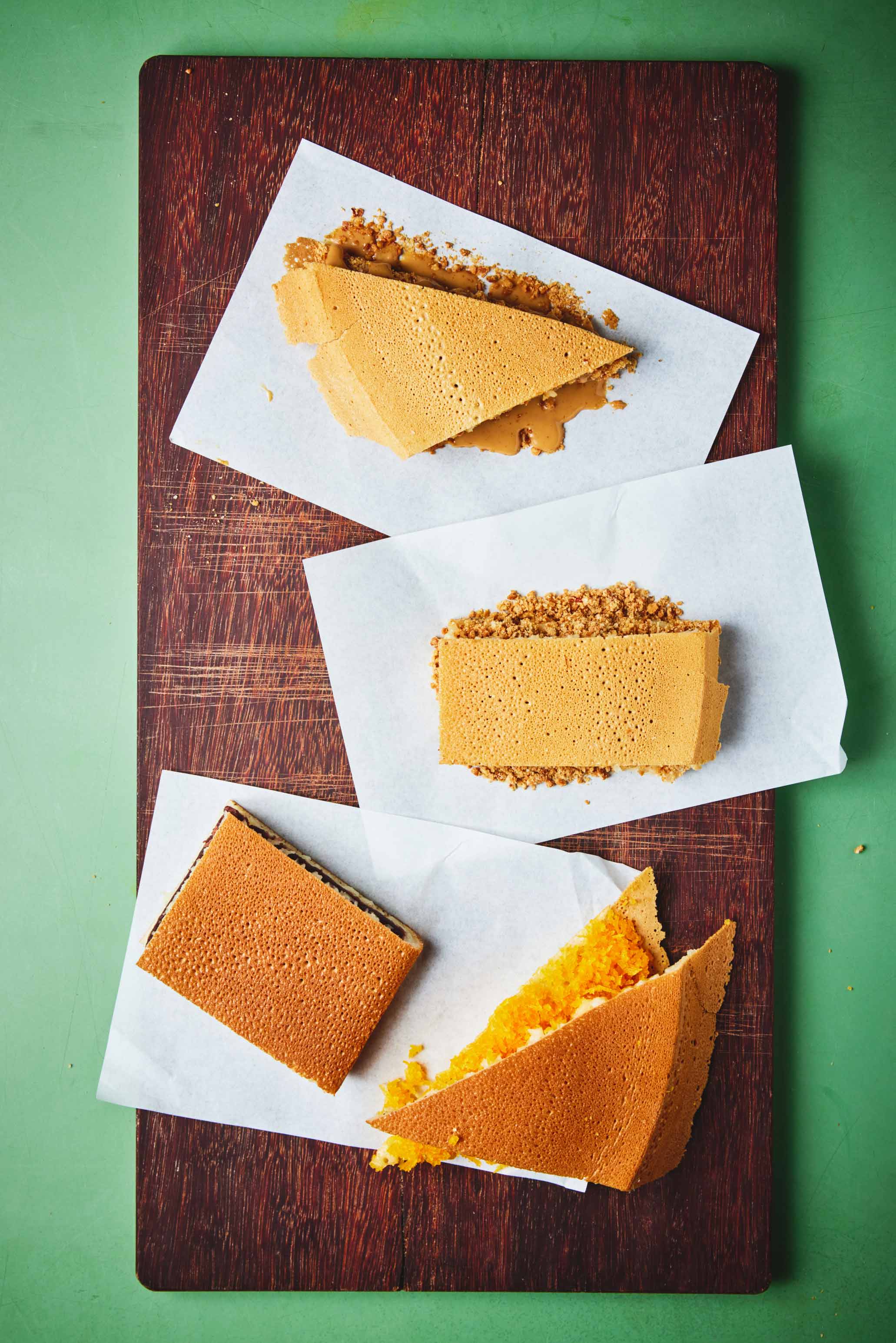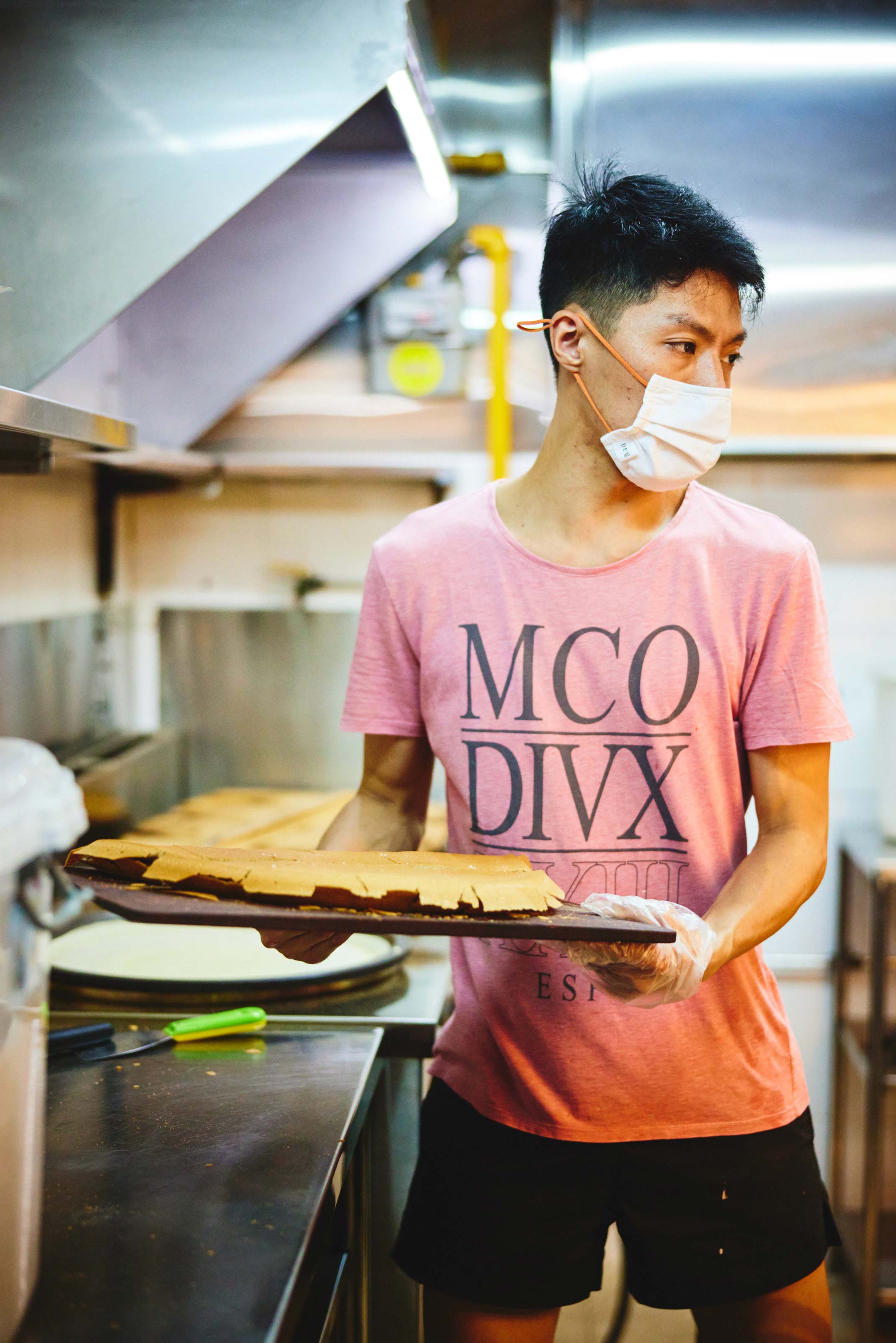 Thirty-year-old hawker Joseph is deft with his actions, spreading batter over three cast iron griddles simultaneously while preparing the fillings. He pauses to catch up with a regular customer while keeping an eye on the almost-ready min jiang kuehs. His multi-tasking ability reminds us of the popular console game, Overcooked. Any slip-up would mean starting over again and testing the patience of an already snaking queue. But he takes it in his stride, working with the precision of a true artisan.