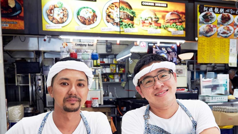 Former co-workers-turned-hawker stall partners Desmond Yong (left) and Silas Lim serve up hearty burgers with local flavours.