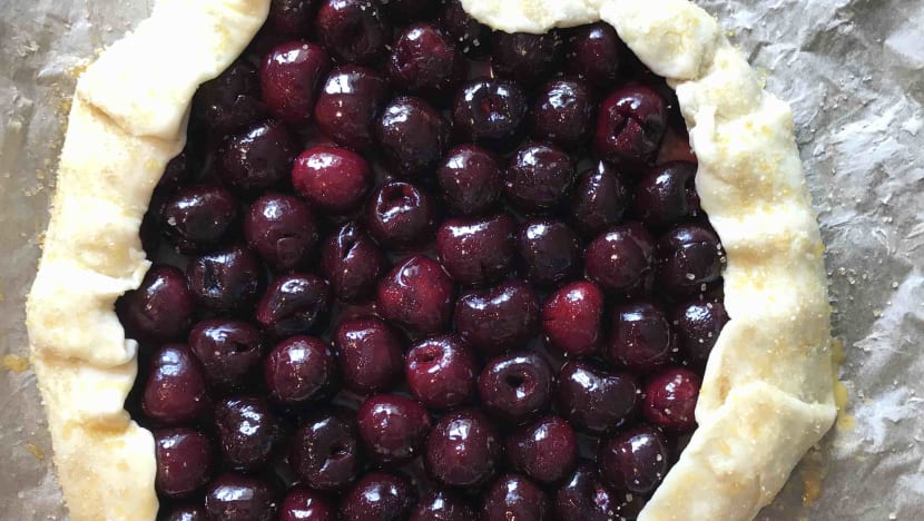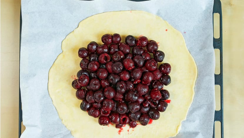 8. Pile cherries onto the center of the dough, draining away any excess liquid from the fruit (you don’t want soggy pastry). Heap cherries slightly in the middle, leaving a 2-inch border around the dough’s circumference. Fold the dough border over the fruit, pressing and crimping lightly so it adheres to the cherries.