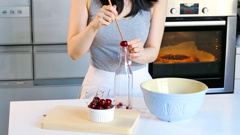6. Preheat oven to 190°C. To pit cherries, remove the stem of each fruit, place atop a bottle opening and position a chopstick in cherry crevice. Push chopstick down firmly to remove pit.