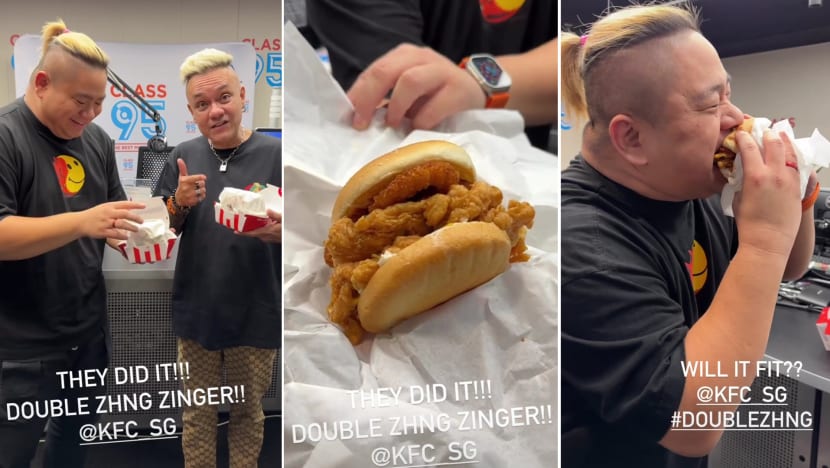 Yummy factor: Ask and it shall be given. A few days ago, Class 95 DJs Vernon A and Justin Ang suggested to KFC to zhng their Zhng Zinger — an epic fried spicy chicken burger with onion rings, fiery sauce, cheddar cheese, BBQ sauce, and pickles — by adding another chicken thigh patty “cos two is better than one”. Well, challenge accepted and the “Zhng Zhng Zinger” was born. The burger was so thick that Justin struggled to bite into it. His review? “Double is the best.”