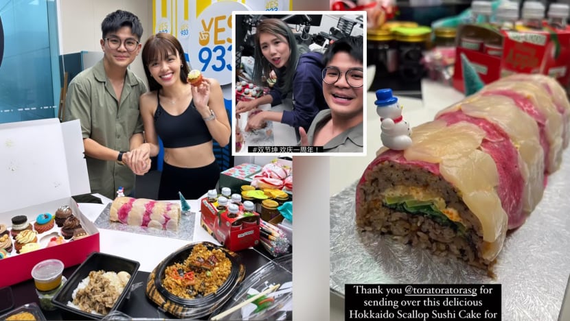 Yummy factor: It’s the first anniversary of Hazelle and Kunhua’s radio show and the YES 933 DJs commemorated the occasion with a mini party in the studio. Thanks to their fans and listeners, they were treated to cupcakes, Japanese eats from Donki like sushi, takoyaki, croquette, gyudon, and even a Hokkaido scallop sushi cake from Tora Tora Tora. The “log cake” looked so good that Evelyn Tan, who had just ended her shift, couldn’t resist helping herself to some.