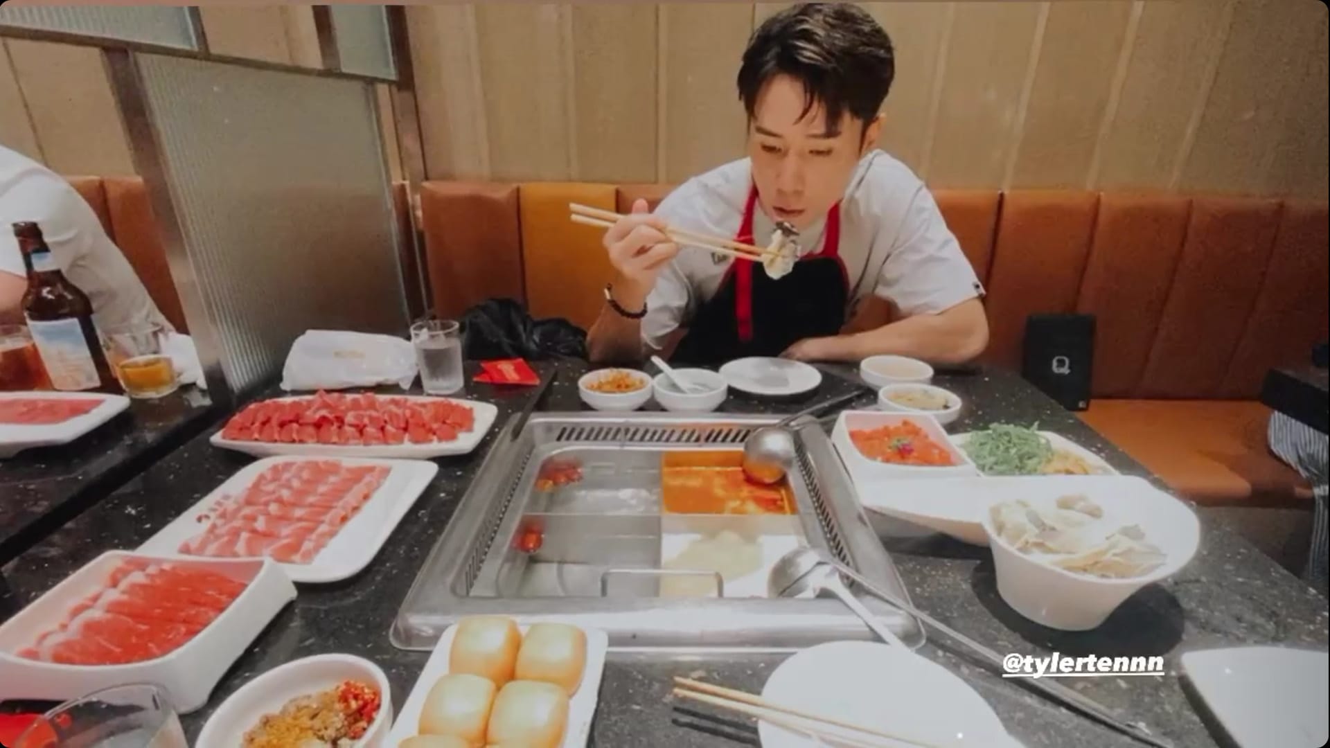 Yummy factor: Tyler rewarded himself with a comforting hotpot dinner after his President’s Star Charity performance. While he admitted he over ordered, we bet tucking into loads of meat, fried fish skin and mantou after a gruelling bungee performance was super satisfying.