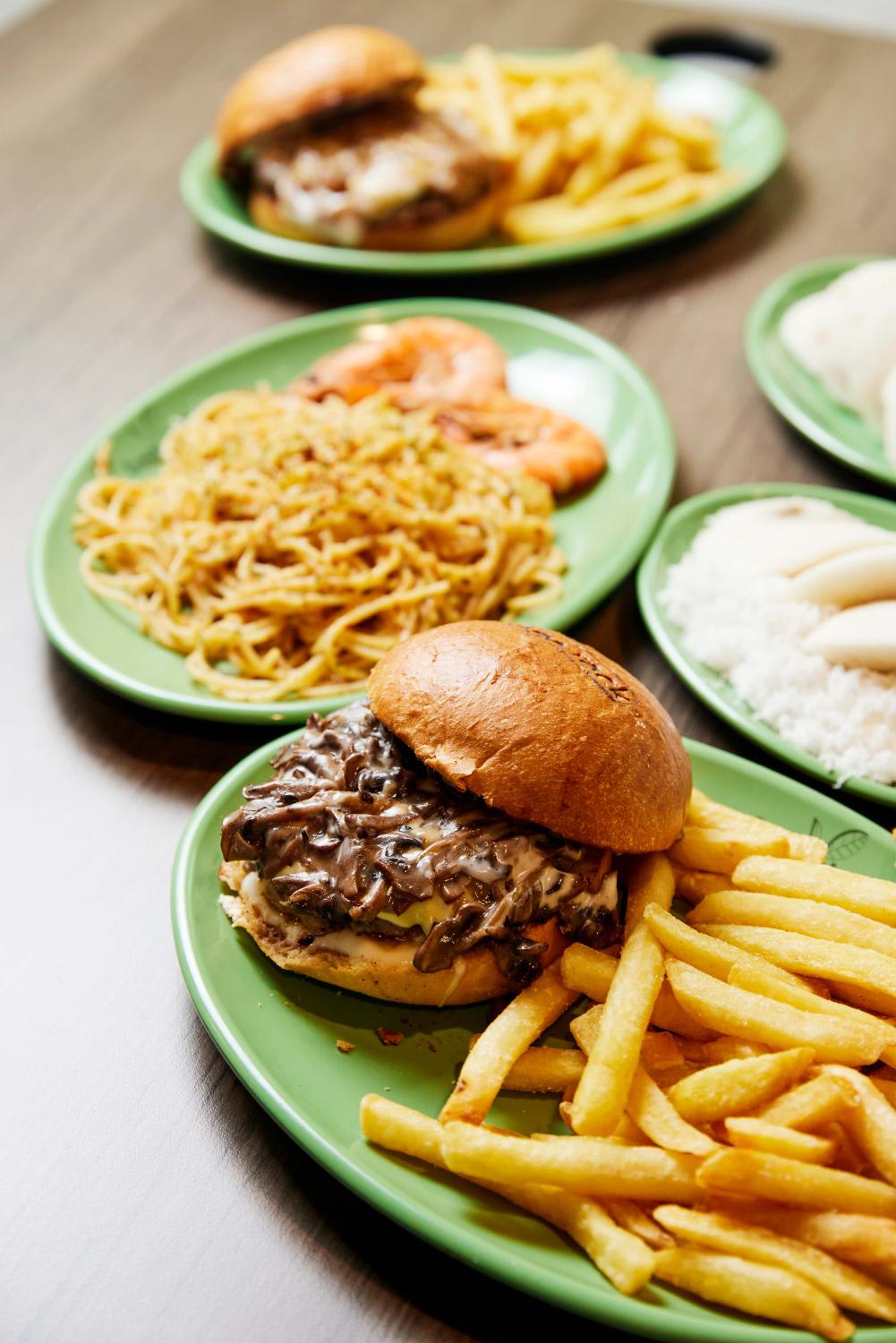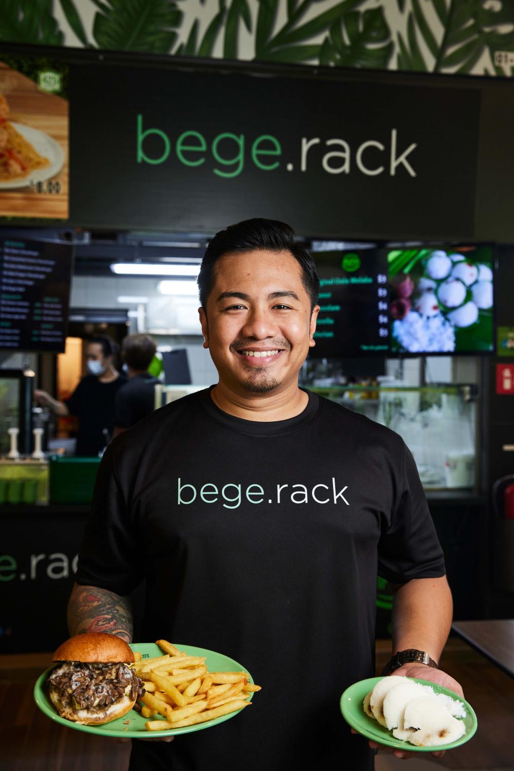 Fancily-designed Bukit Canberra Hawker Centre, which opened in Sembawang last December, is home to a number of exciting new stalls including home-based biz turned hawker joint Liu Kou Shui. Here’s another contender vying for your stomach space: Muslim-owned Bege Rack, a hawker stall which at first glance, appears to be shared by two separate brands (there’s also ‘Chong Pang Putu Piring’ at the bottom of its storefront). As it turns out, the stall is run by the same hawker, Muhammad Syarafuddin, 33, who peddles both putu piring (Malay steamed rice flour cakes stuffed with melted gula melaka and served with grated coconut) as well as burgers and steaks.