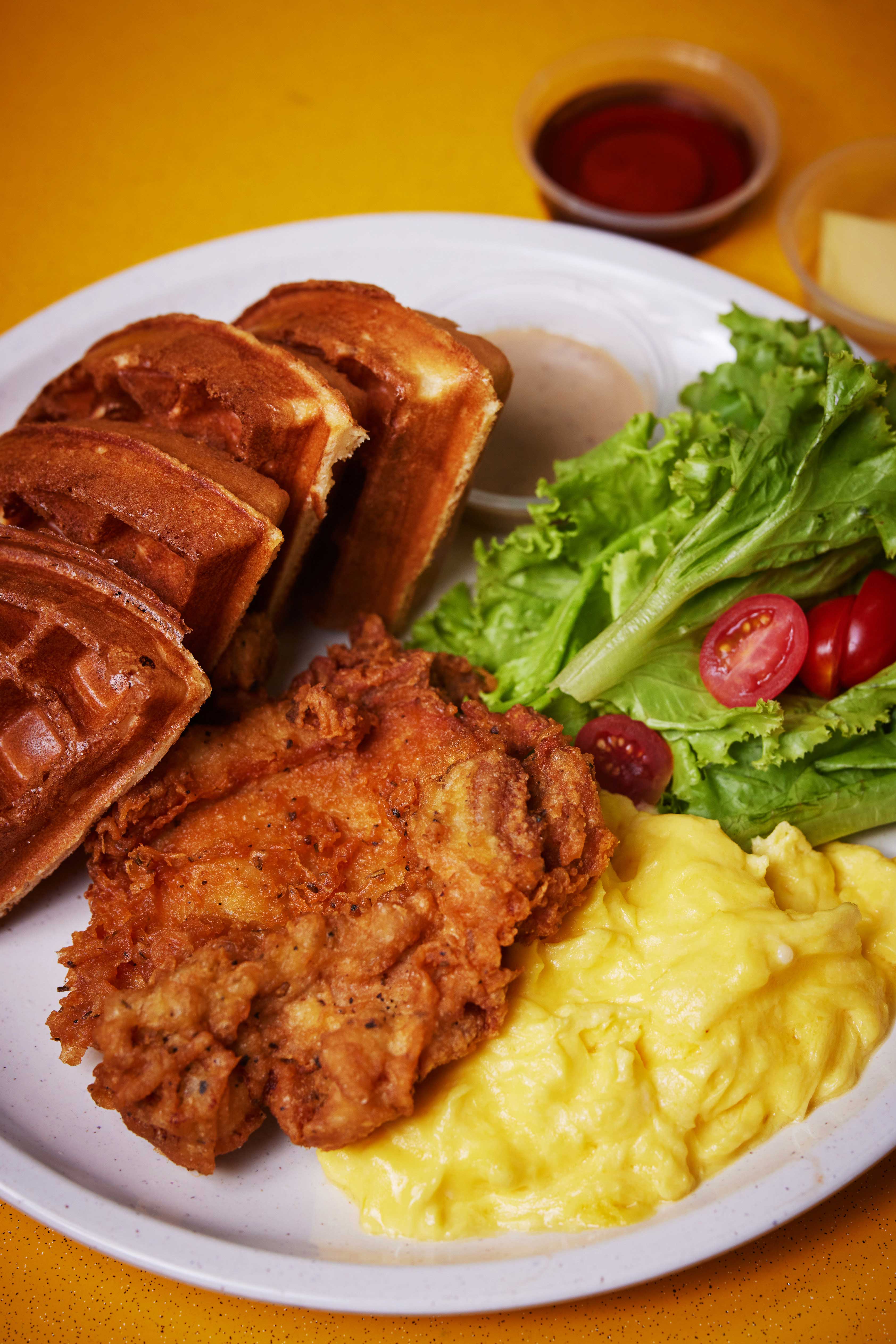 Crispy on the outside and light and fluffy in the middle, the waffle boasts the requisite eggy fragrance and forms a yummy vehicle for the accompanying maple syrup and butter. The chicken cutlet is juicy beneath its crunchy, peppery shell, while creamy scrambled eggs add a lovely textural contrast to the platter. To keep the meal from becoming too heavy, there’s also a simple garden salad with sesame dressing on the side.