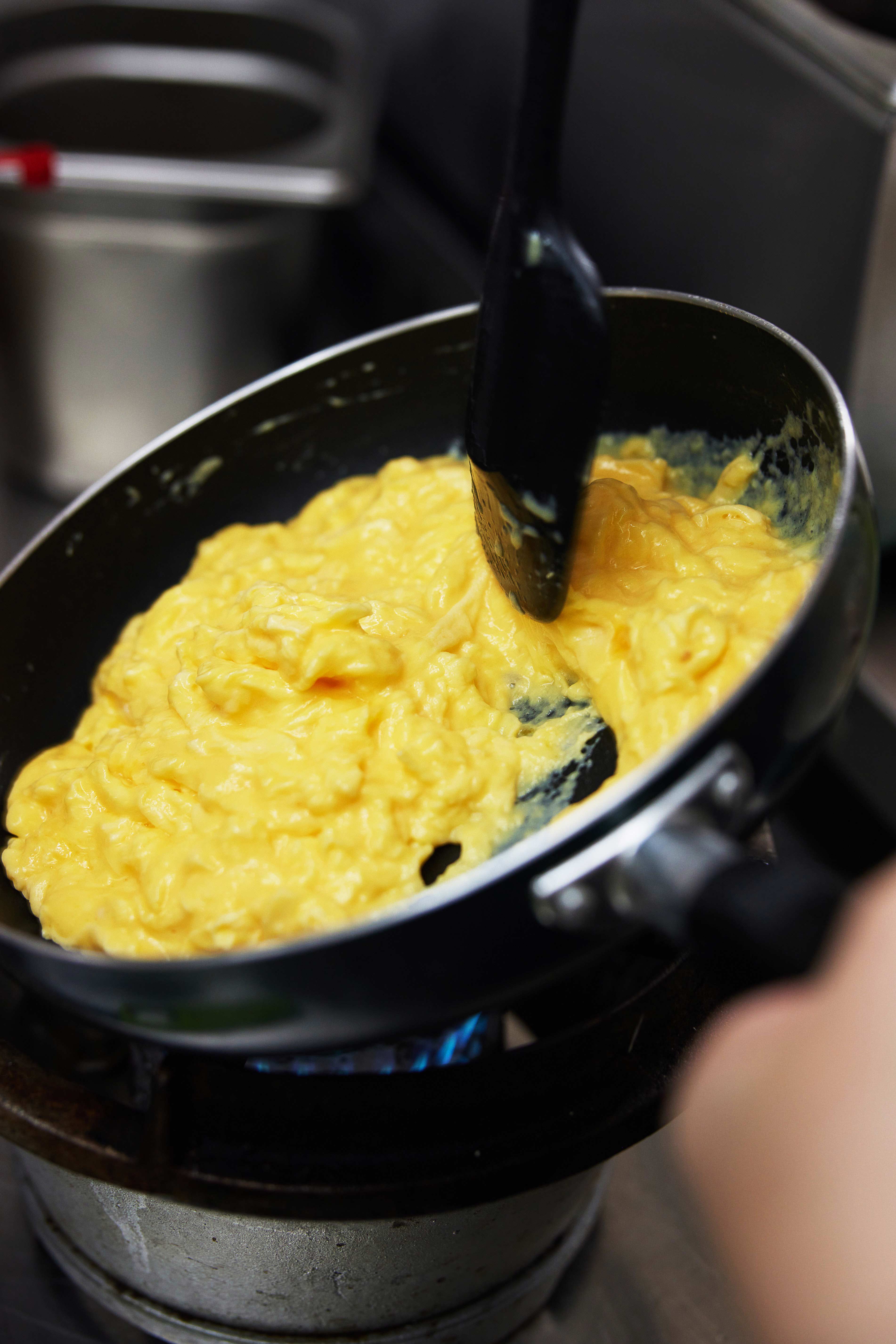 The delicate shreds of Idaho potato – prepped daily by the team – retain their shape and offer a pleasant, light texture as we bite into the pancake, which has a crispy exterior thanks to the hefty amount of butter used. Seasoned simply with salt and pepper, the rosti goes perfectly with a smear of sour cream served on the side. Together with silky scrambled eggs, juicy smoked pork bratwurst and garden salad, this makes a light but satisfying meal.