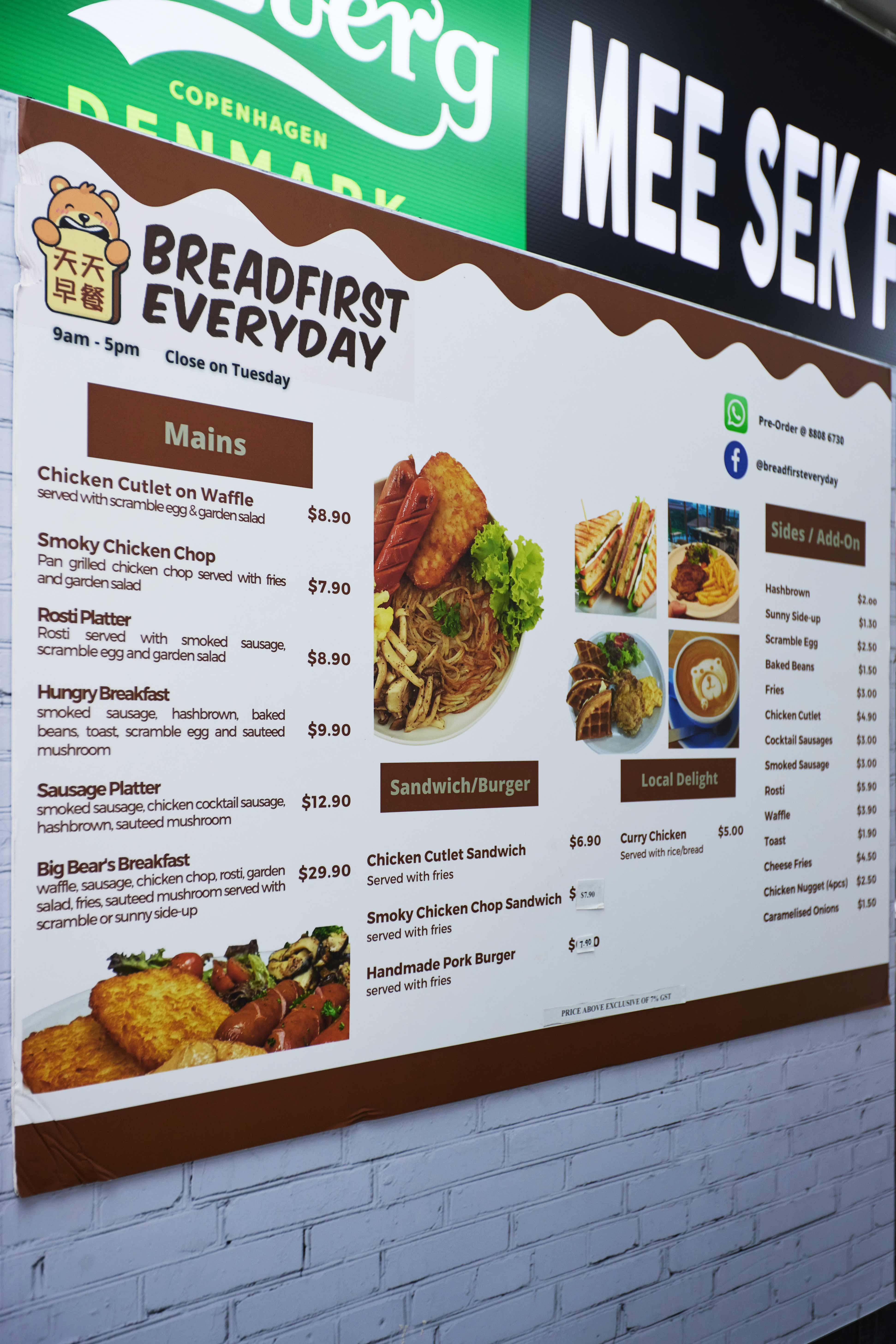 Tucked in Mee Sek coffee shop in Kovan, which also houses popular joints Ponggol Nasi Lemak and Qi Xiang Chicken Pot, Bread First Everyday is a one-month-old stall that serves all-day brunch and classic Western fare like Swiss-style rosti, chicken chop, burgers and fried chicken and waffles.