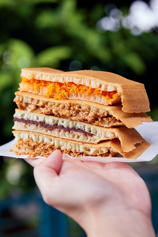 The Red Bean and Peanut Butter flavours are also worth trying; Kwong Cheong Thye’s thick, good quality red bean paste goes well with the pancake, and so does the creamy peanut butter that Ching Ching drizzles over our slice before serving with a scattering of crunchy peanuts. Very yummy.