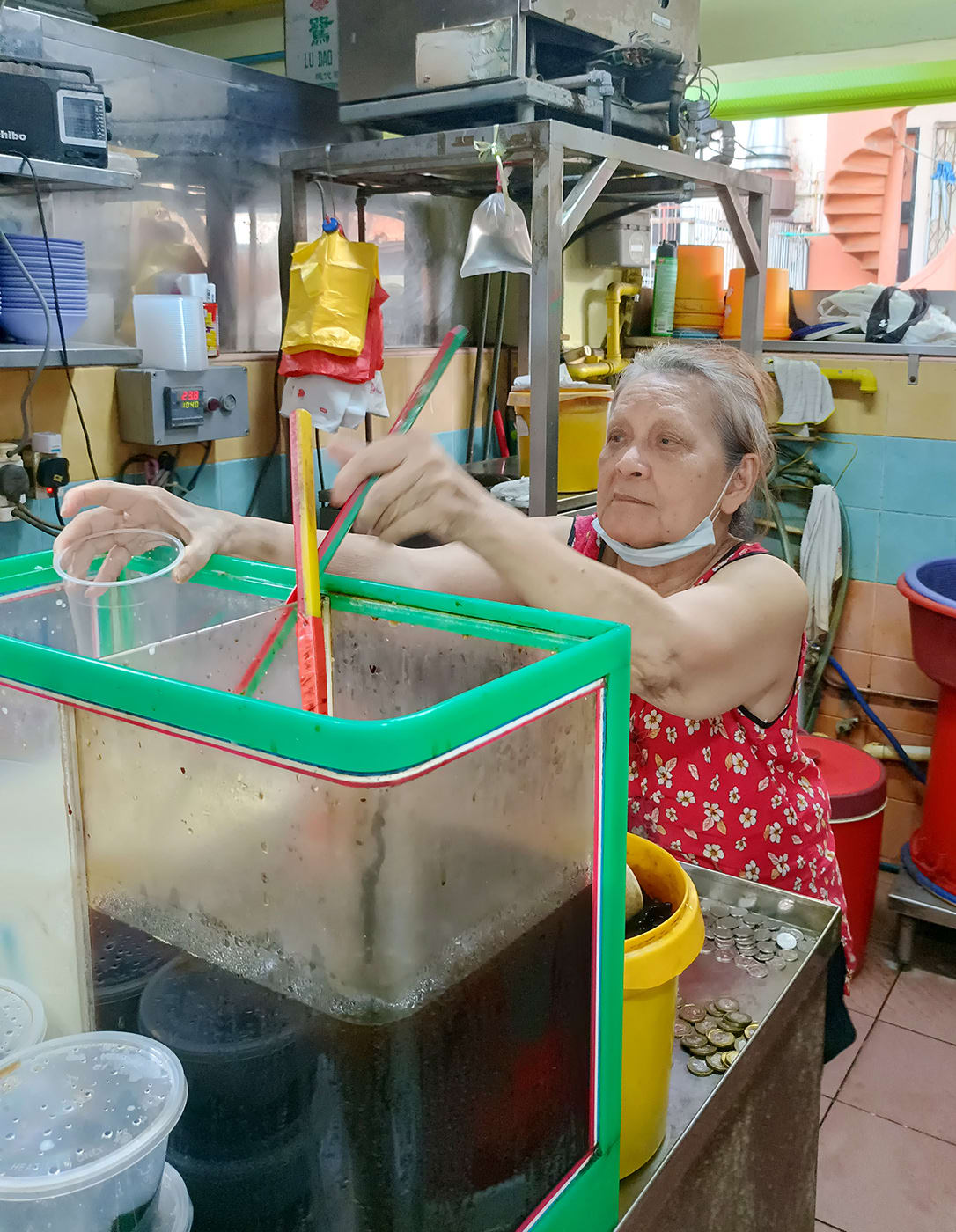 Since the ’80s, they have been making and selling tau huay zui, grass jelly drinks and desserts out of their stall Tekong Soya Bean Drinks & Curd on the second level of Dunman Food Centre and still display their beverages in old-school acrylic drink containers. While they used to operate till 2am several years ago, they now run their stall from 9am to 10pm daily. They show up from 8am for prep work.