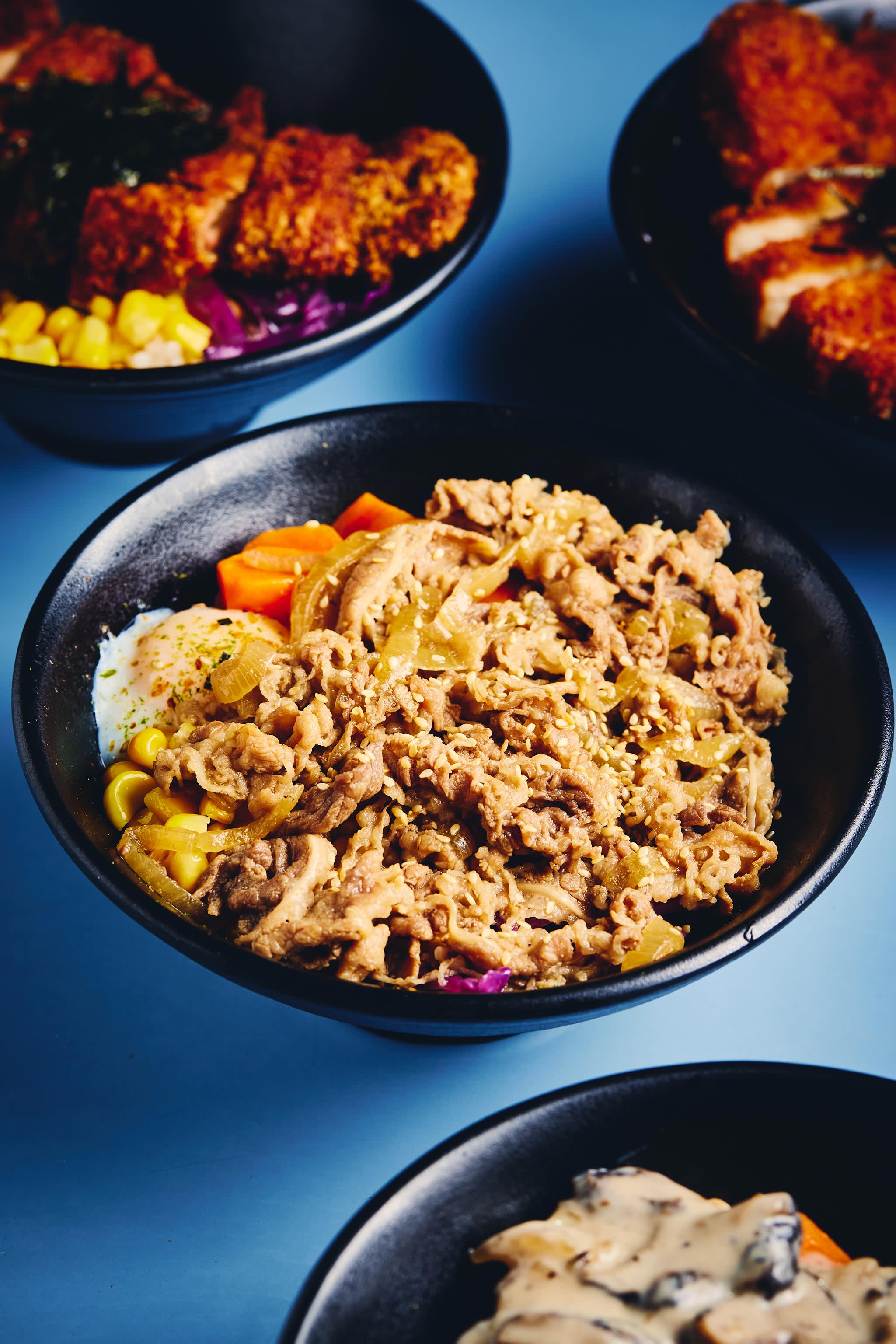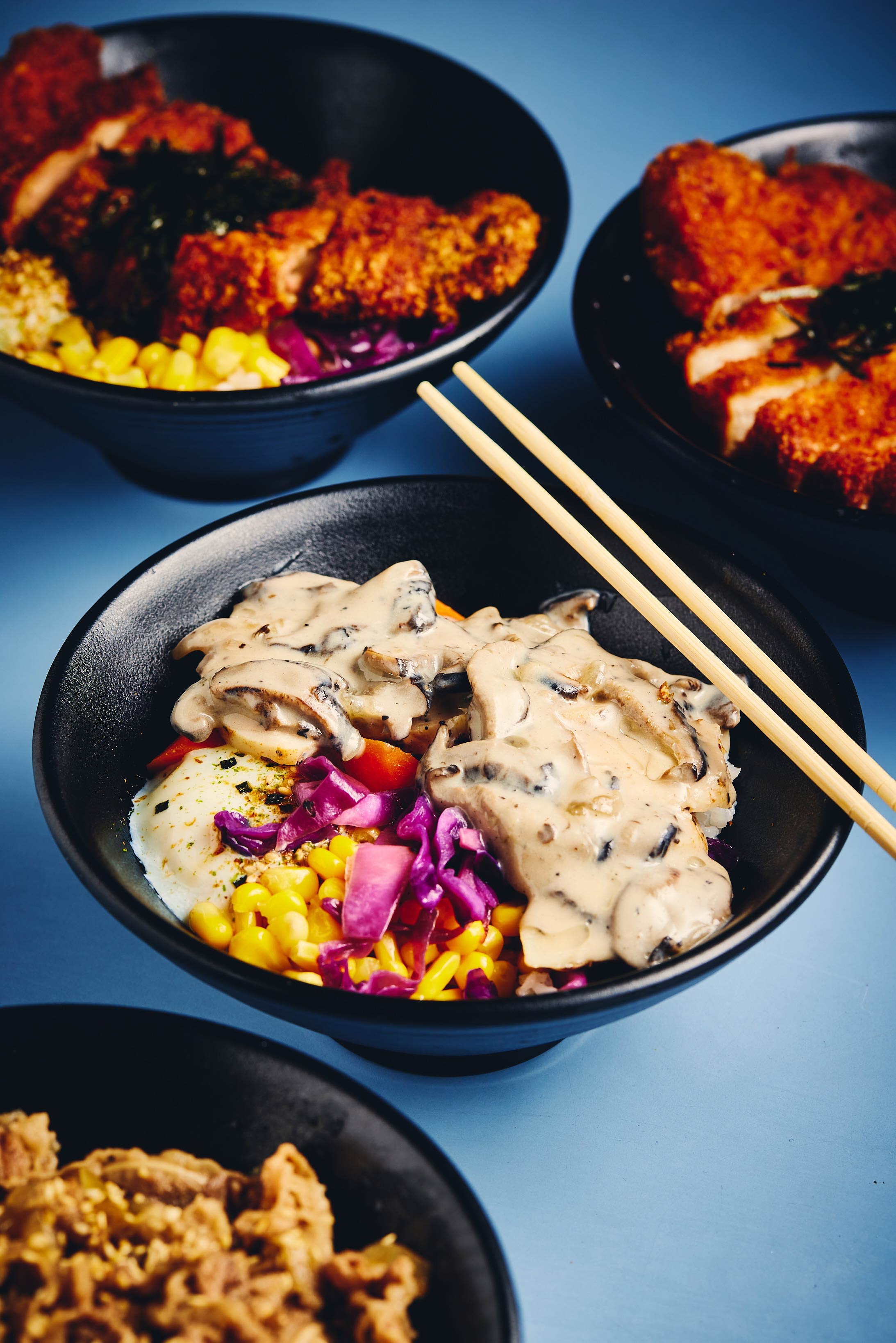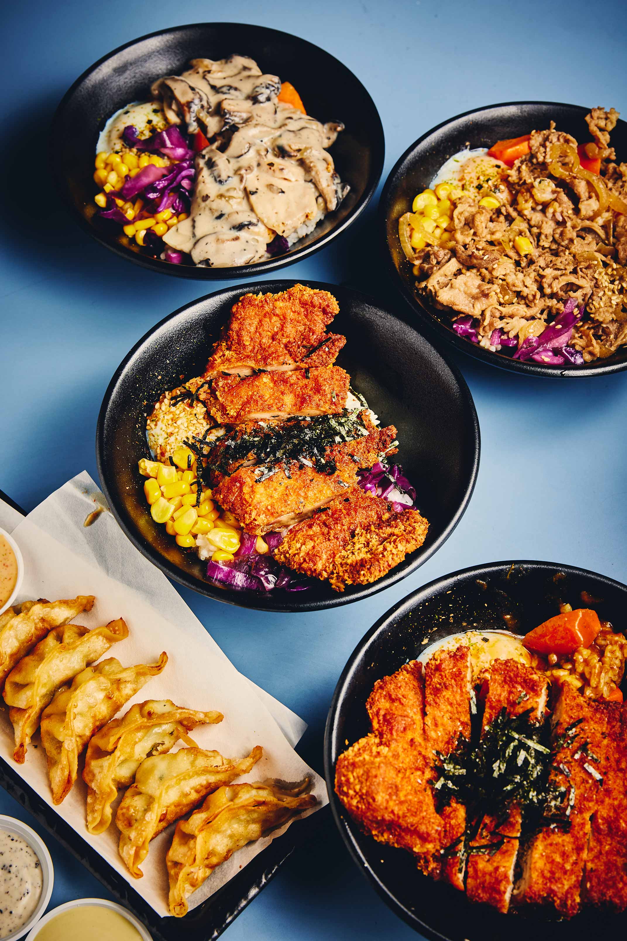 He sells mod Japanese rice bowls like cheesy katsu don.