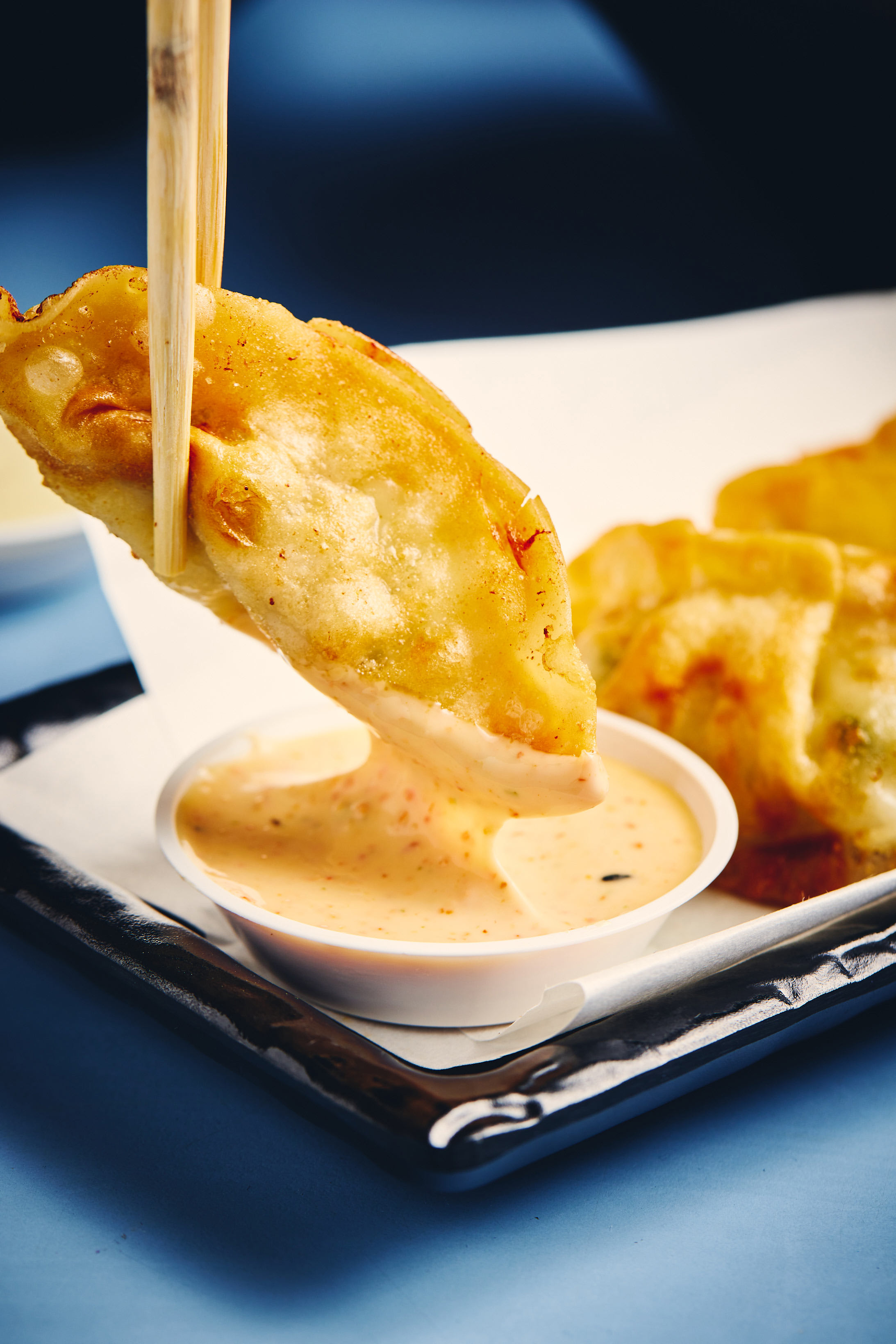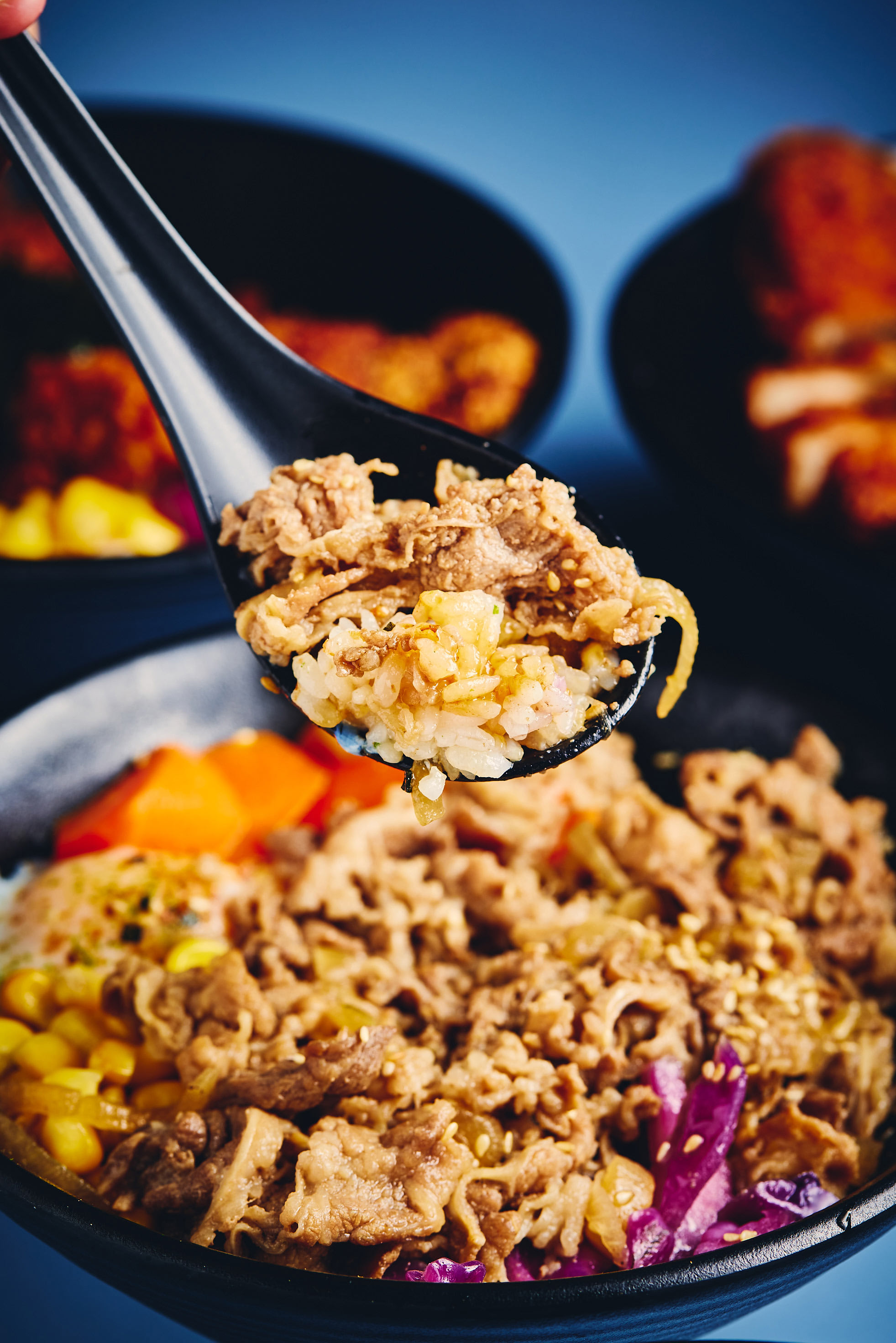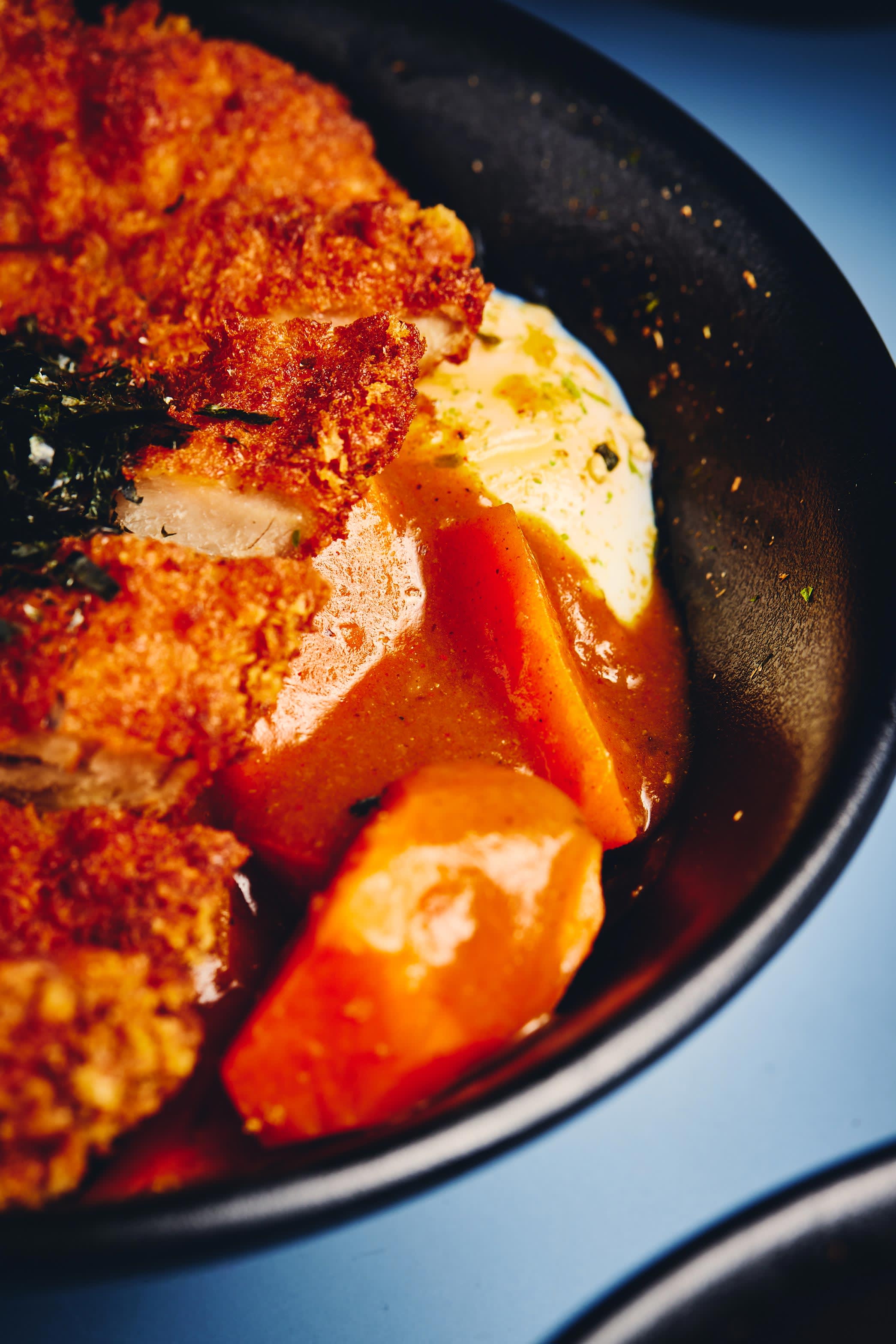 He sells mod Japanese rice bowls like cheesy katsu don.