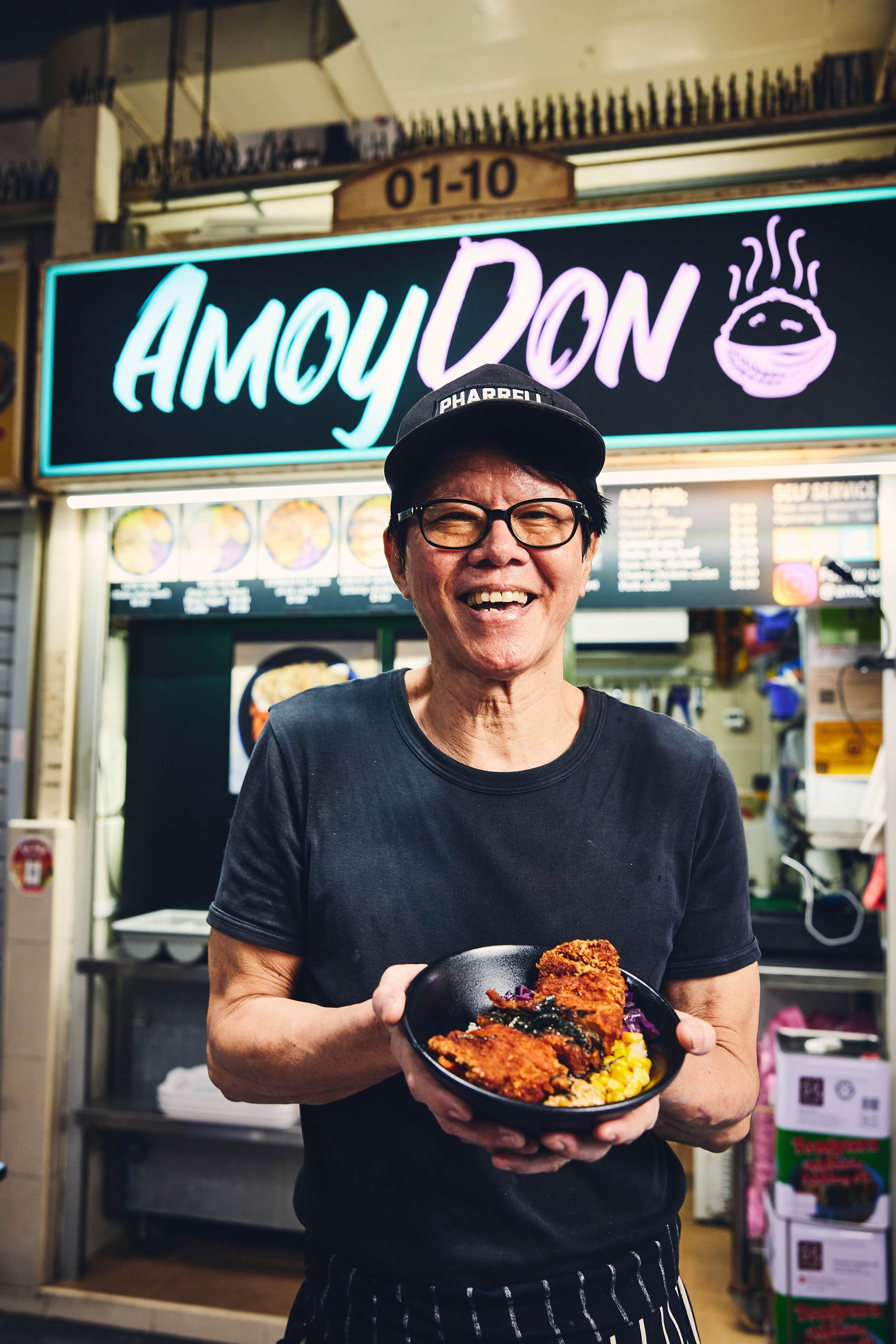 Everyone has dreams, but not everyone has the courage or the means to pursue what they desire. Enter 67-year-old Kelvin Ong — after supposedly retiring from working for 35 years as a hairdresser, he finally did what he truly wanted, which is to cook for a living. He is the proud hawker behind modern Japanese rice bowl joint Amoy Don at Amoy Street Food Centre. Why slog in what seems like an even more gruelling job post-retirement? “It makes me happy,” he says simply.