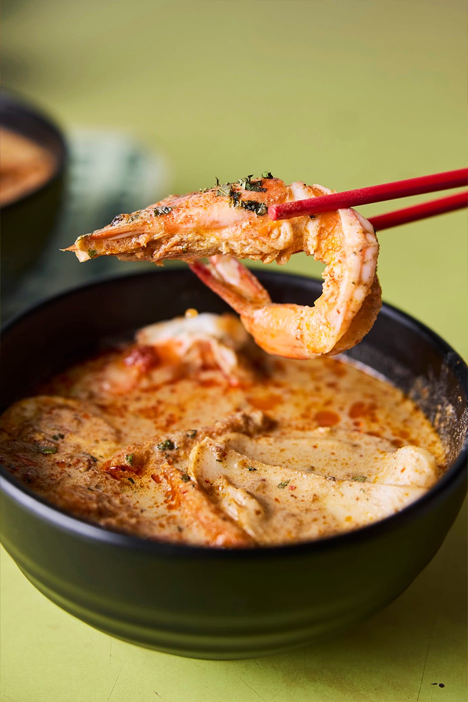 The crustaceans are naturally sweet and bouncy, cooked just right so they stay firm but juicy. Suck on the prawn heads (go on, you know you want to) and you’ll get that satisfying hit of briny, umami-rich juices that mingle beautifully with the creamy laksa gravy. Yum.