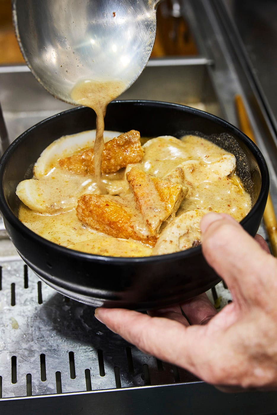 He uses a supplier-made spice paste, which he elevates with his own touches, adding dried shrimp, cloves and sambal to deepen the umami and fragrance. The result is a gravy built on decades of instinct and experimentation.