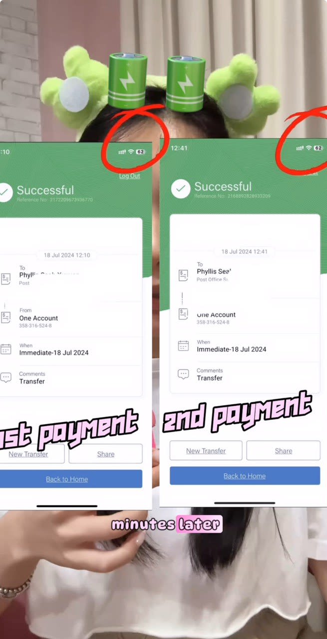That was when she got suspicious and scrutinised the transaction screenshots. She discovered a telling detail that gave away the scam: the first bank transfer that Mr Chen claimed to have sent at 12.10pm showed his phone with 62 per cent battery life. The second transfer screenshot, sent half an hour later at 12.41pm, also had the same amount of battery life left.