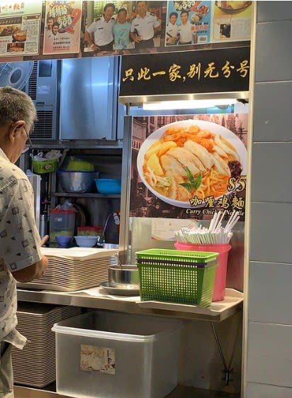 The Tanjong Pagar Plaza stall, however, appears to be related to the Albert Centre Fu Hai Curry Chicken Noodles — both sport the same black-and-gold signboard along with newspaper features and photos of the stallowner with celebs like Bryan Wong and Cavin Soh. What’s missing, though, is that amusingly terse “one of a kind” notice.
