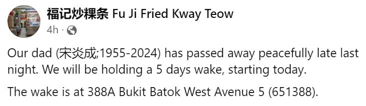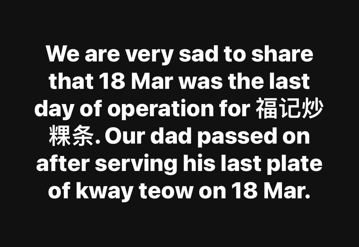 The notice stated: “We are very sad to share that 18 Mar was the last day of operation for 福记炒粿条 (Hock Kee Fried Kway Teow). Our dad passed on after serving his last plate of kway teow on 18 Mar.”
