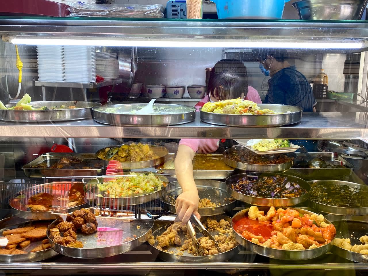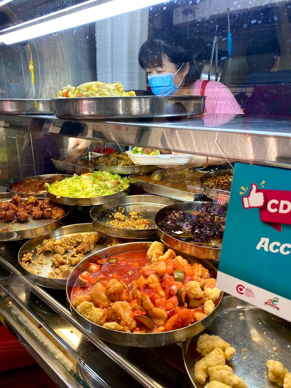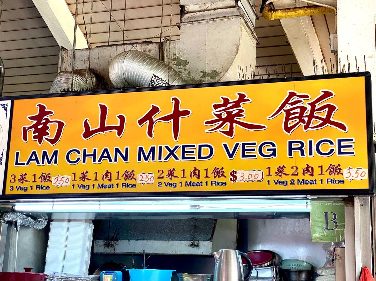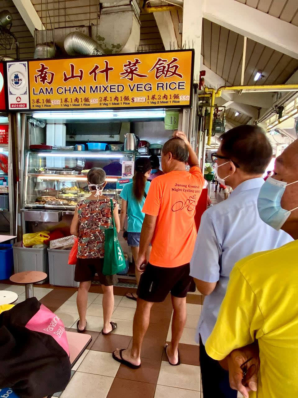 But longtime Jurong East hawker stall Lam Chan Mixed Veg Rice is still selling its economic rice at economical prices — a plate with 1 veg + 1 meat, or 3 veg (all with rice) costs just $2.50.