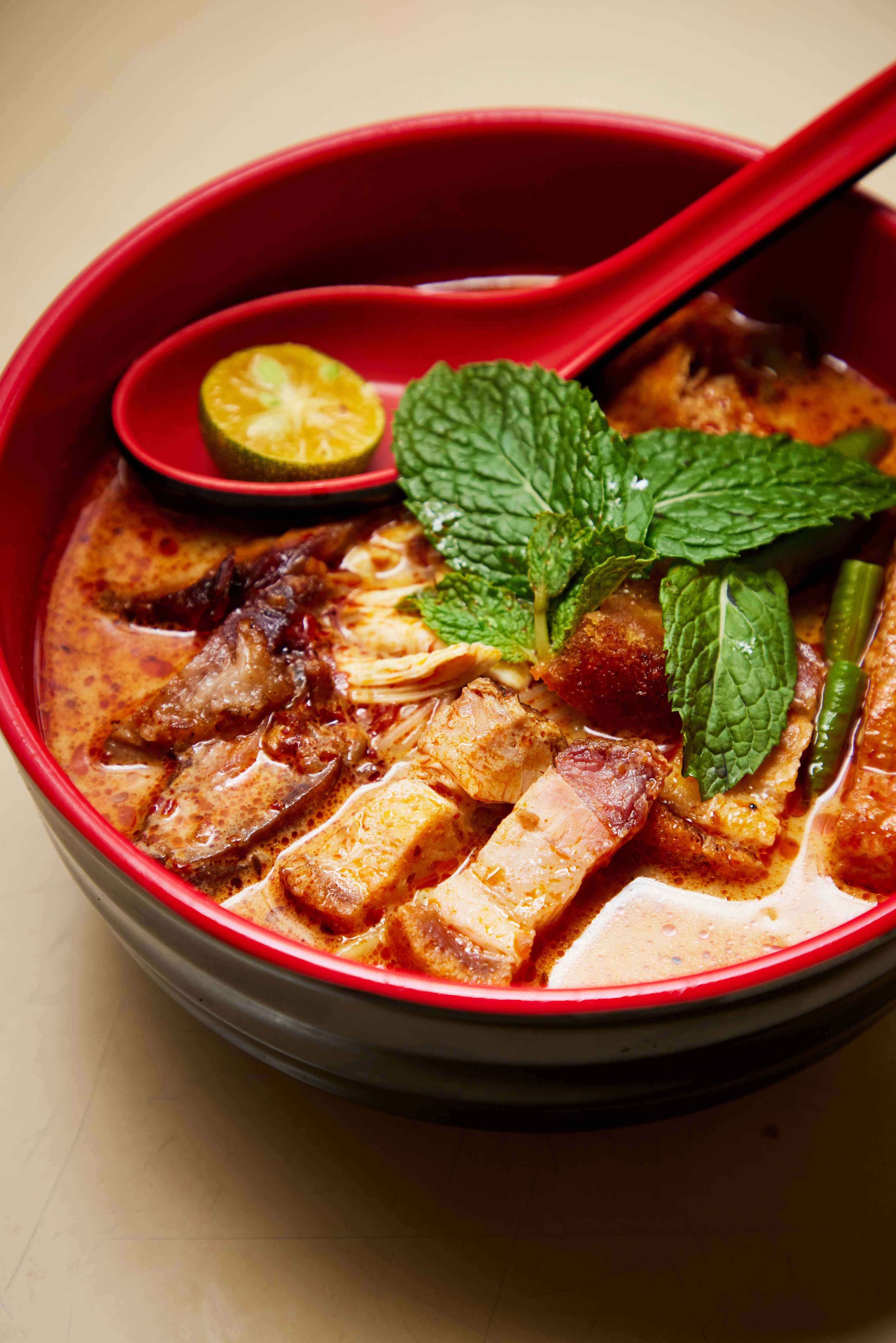 It’s no random pivot. The house-made roasts are a replacement for the supplier-bought meat toppings that characterise Ipoh-style curry noodles. And that’s why the new outlet’s signboard is rather confusing, with a mix of curry mee and roast meat images crammed on it.