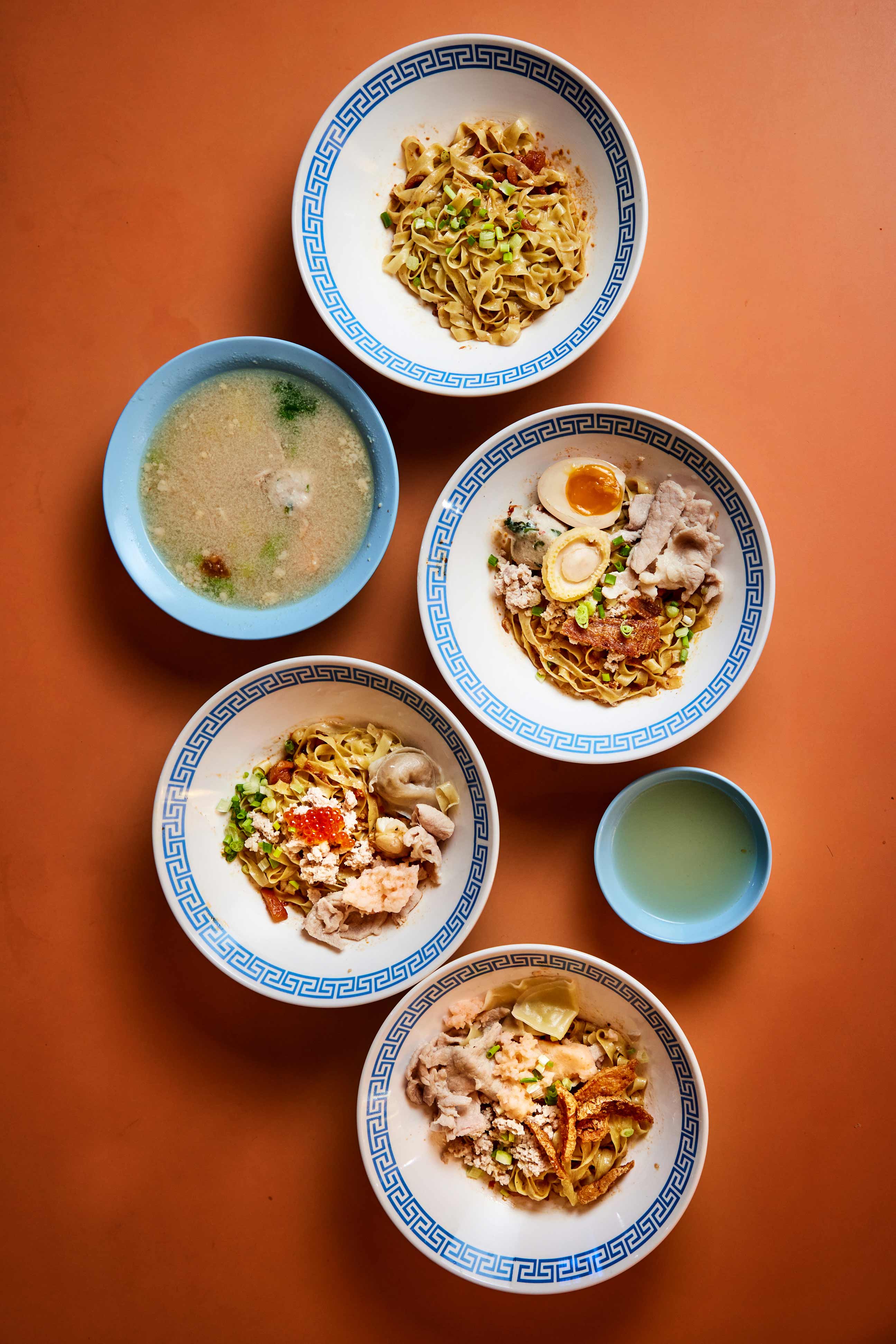 They run this noodle stall – located just down the row from Roast Paradise – with three other shareholders: Nicholas Kong (right), 32, who quit his job as a web developer to work as a full-time hawker here; Tan Shi Xiong (below, leftmost), 31, who works in sales in the finance industry; and Samuel Ow, 31, a self-employed designer who wasn’t present at the shoot. The last two partners kept their day jobs – Shi Xiong handles finances and marketing for the stall, while Samuel does the designing and photography.