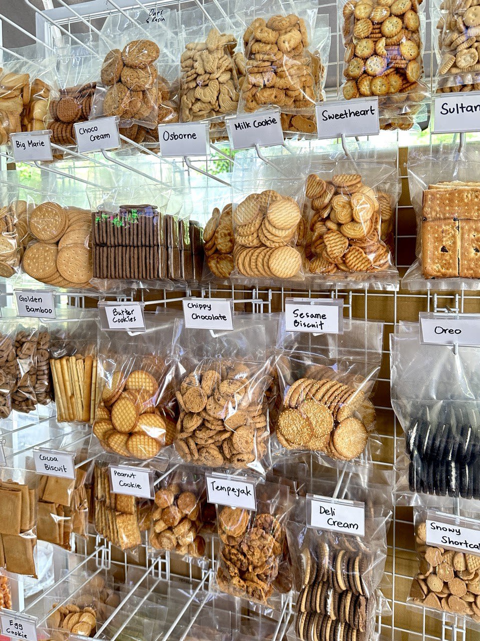 The items he sells include classic delights like the aforementioned iced gems, animal-shaped ‘zoo biscuits’, five spice powder-flavoured ‘big and small ear’ biscuits, all kinds of wafers and sandwich cookies, and even Merlion-shaped cookies.