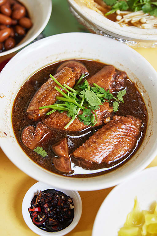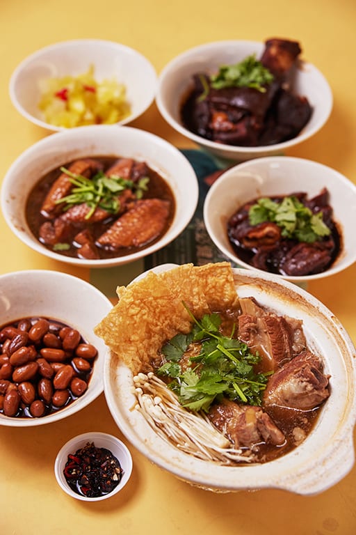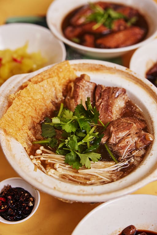 Still, we feel nourished slurping up the piping hot soup along with the succulent pork ribs, plus beancurd sheets and enoki mushrooms that soak up the broth. Fluffy white rice and a flavourful medley of condiments provided (cut red chillies with raw minced garlic and dark soy sauce) round up our solidly satisfying meal. The bak kut teh is good enough on its own, but if you feel like ordering some trimmings, the braised peanuts and delicately crunchy preserved vegetables make decent sides.