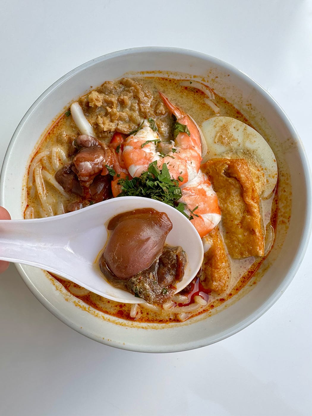 It also includes ‘fancier’ toppings like an extra dollop of ground hae bee and three fresh blood cockles. These aren’t the puny ‘hums’ you typically find in hawker laksa, but plump, good-sized ones, each around the size of a teaspoon head.