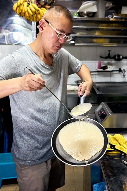 But the unusually philosophical hawker has a new perspective on work after his hiatus. He muses: “I have decided to run my stall like how I travelled — just go with the wind!” His muffin ovens are still placed prominently at the front of the stall, though he no longer uses them and relies on a crepe pan these days. “There’s nowhere to store my ovens anyway,” he deadpans.