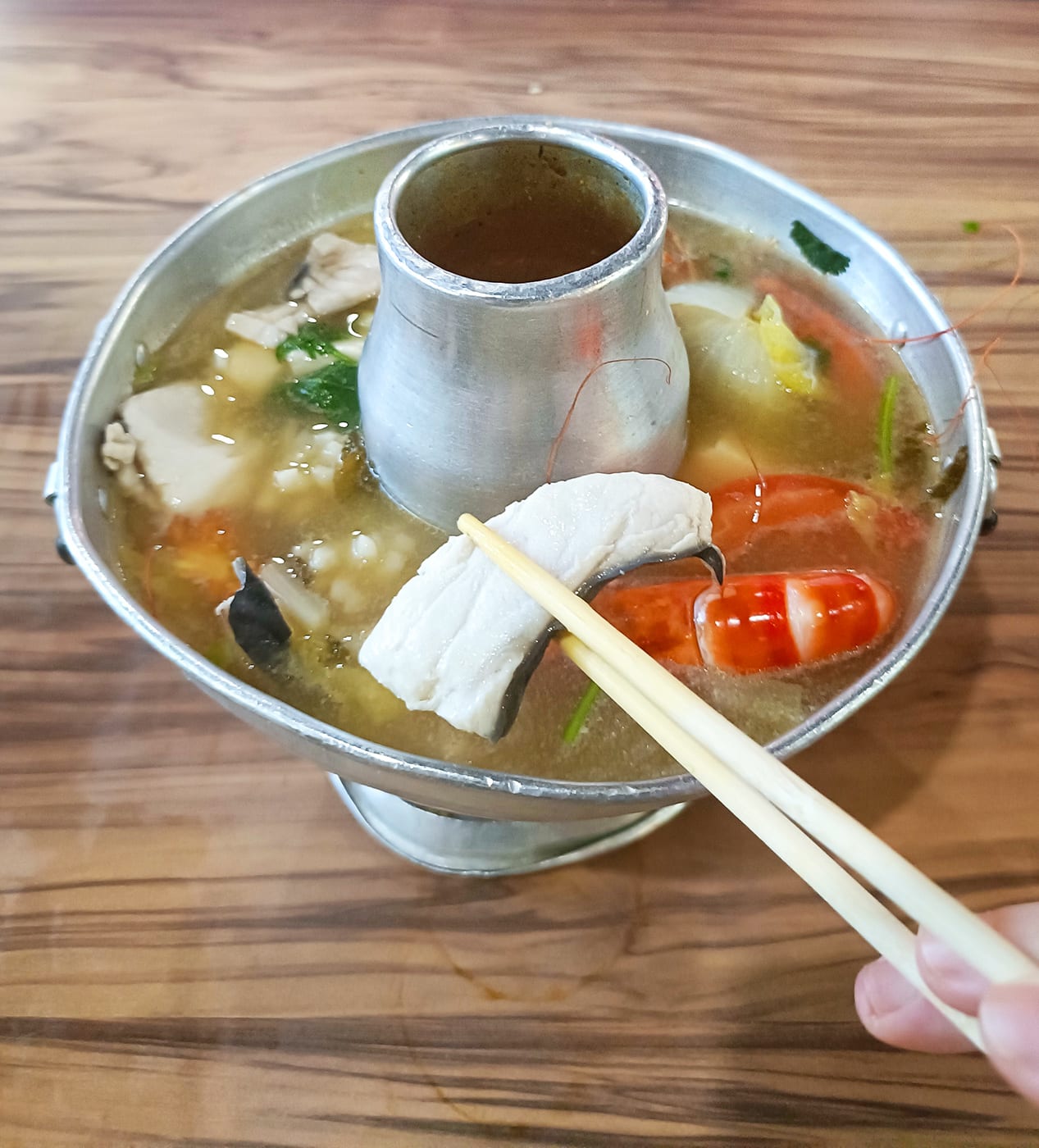 Think of this as seafood soup served in a hotpot for one. Instead of cooking the food yourself at the table, the hawker boss blanches the seafood in broth at the stove before serving it in a beaten-up aluminum hotpot about the size of a ramen bowl. Very grittily retro.
