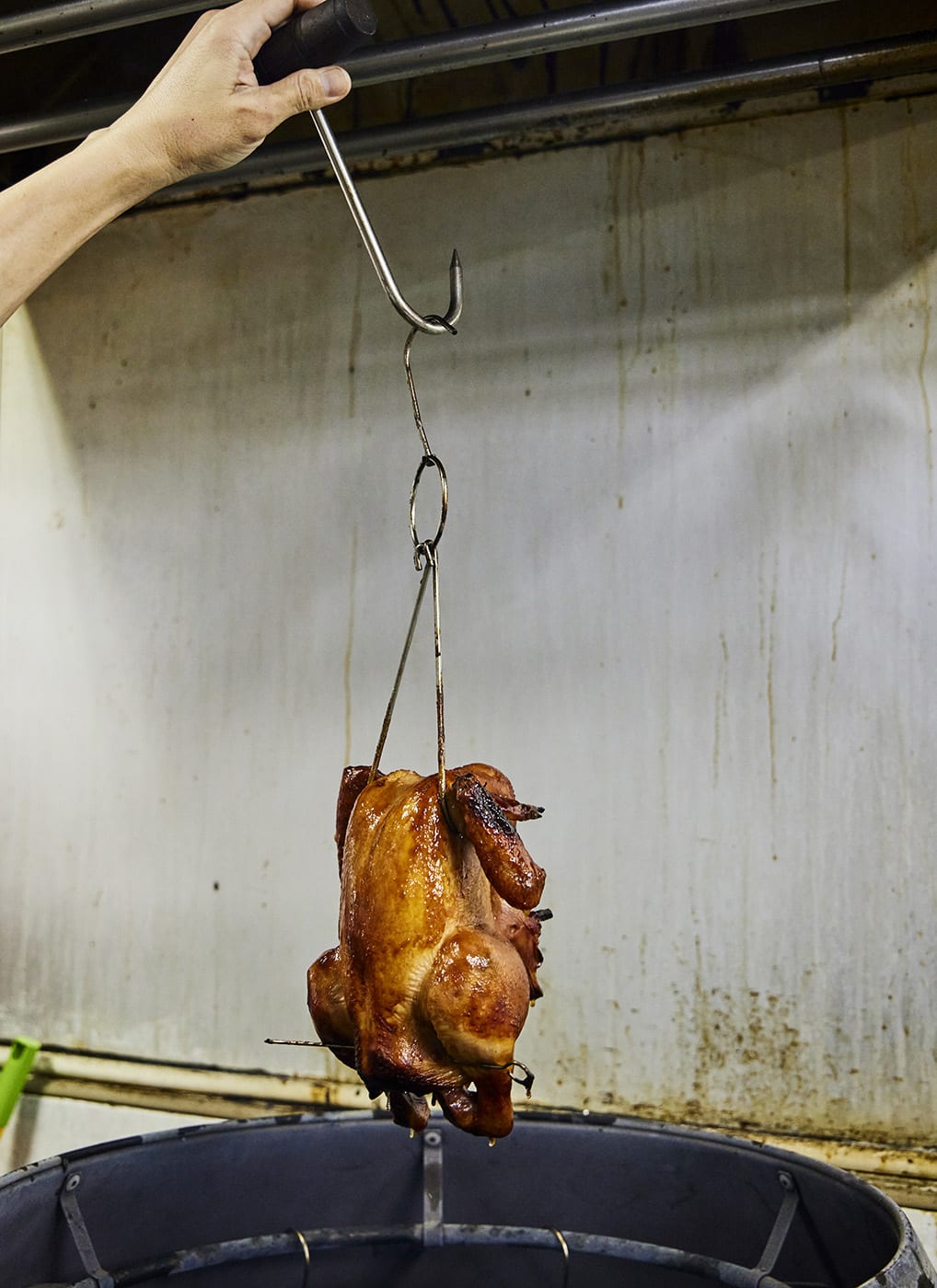 The birds are cooked in a stainless steel barrel over a charcoal fire. Sugarcane chunks are added during the roasting process to infuse the meat with a sweet, smoky flavour.