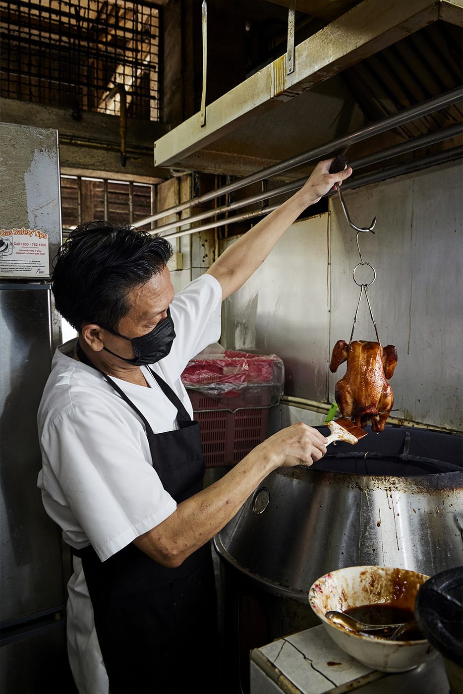 Gilbert uses fresh Malaysian kampong chickens weighing about 1.6kg to 1.8kg. The birds are brined for eight hours then marinated overnight in his “secret char siew-style marinade” before they are charcoal-smoked for around an hour.