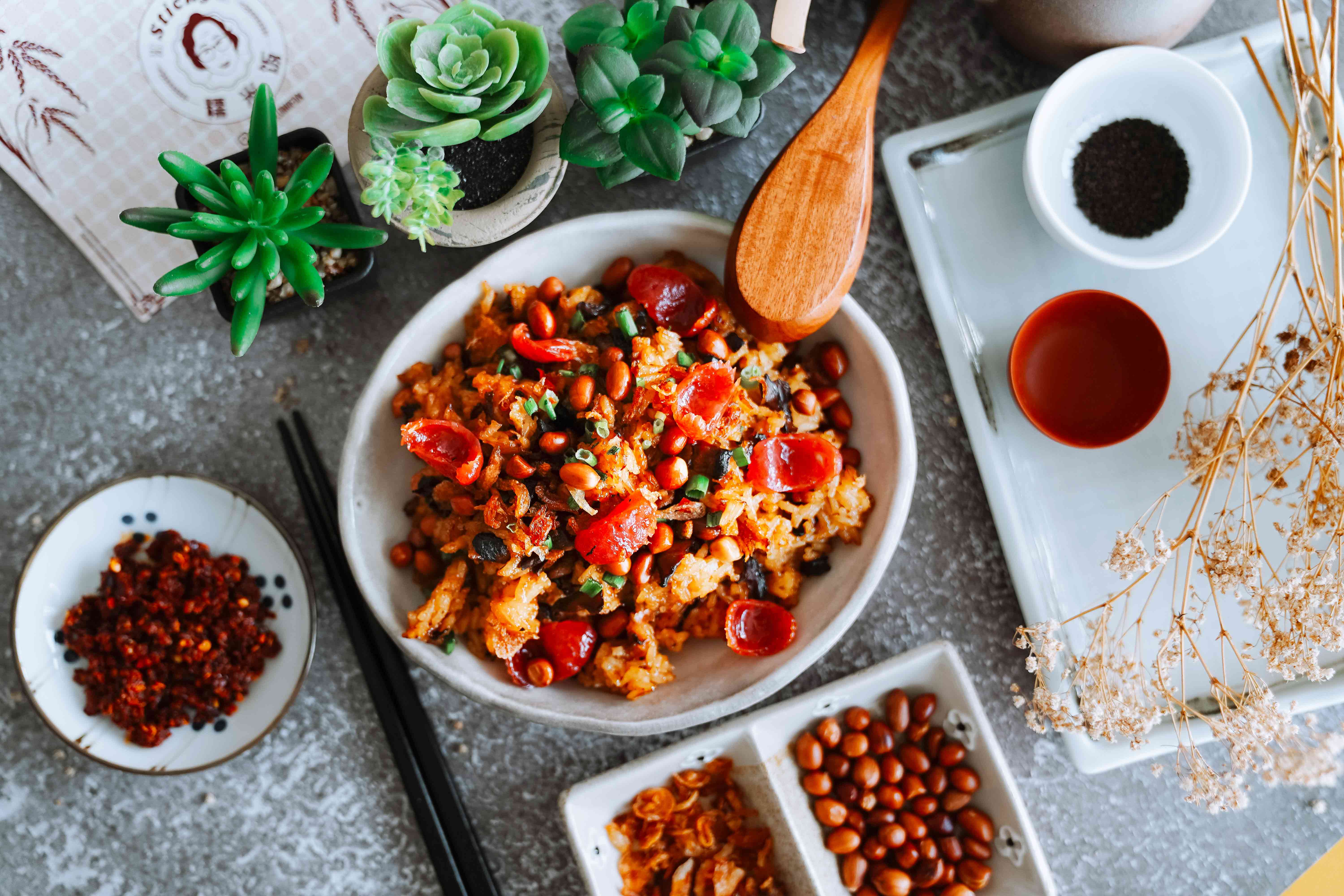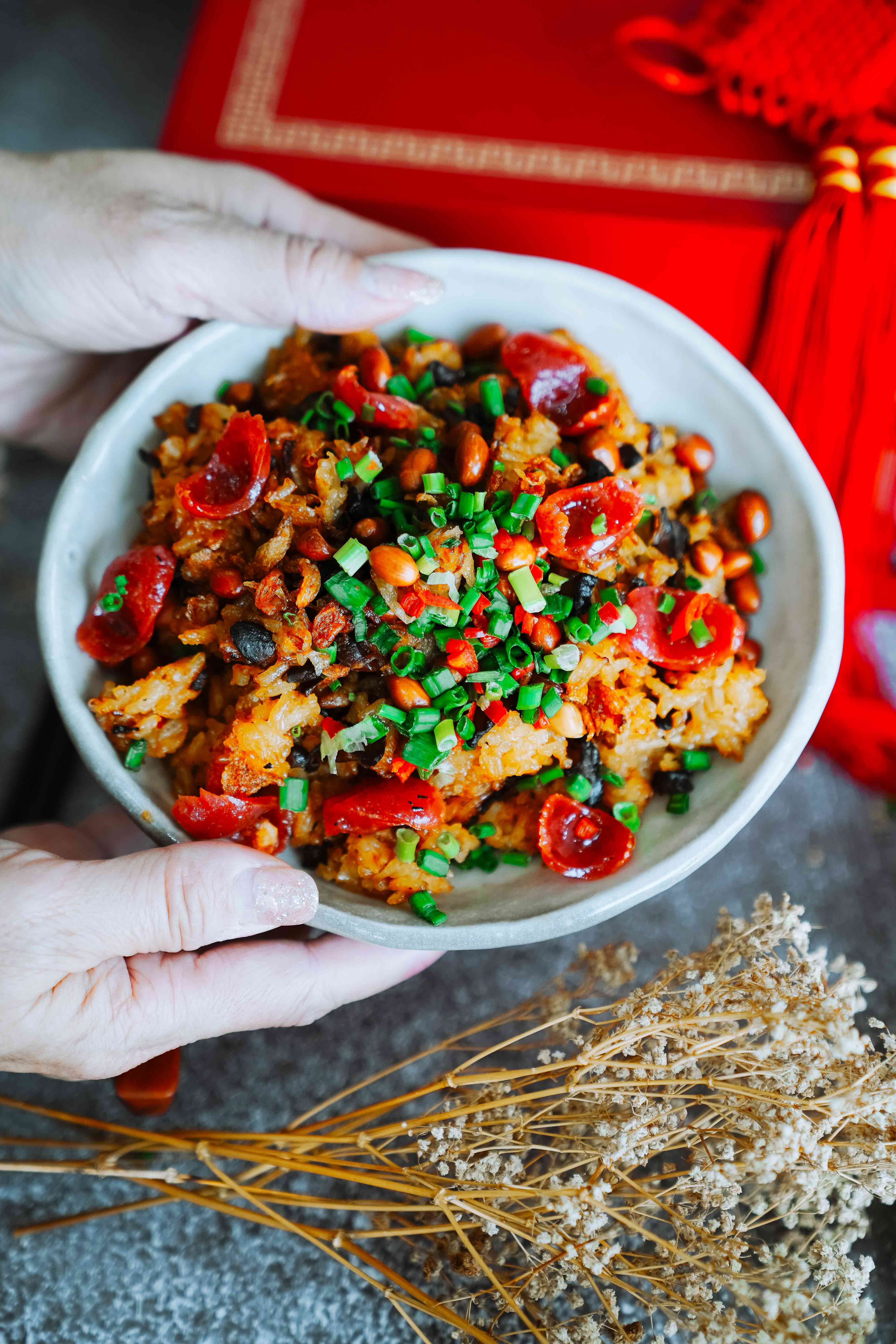 The nuo mi fan is topped with baby abalone and premium lup cheong.