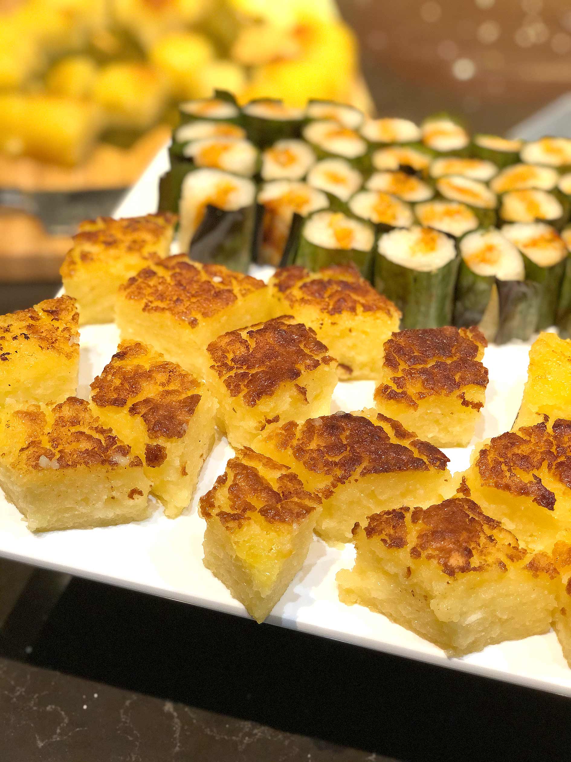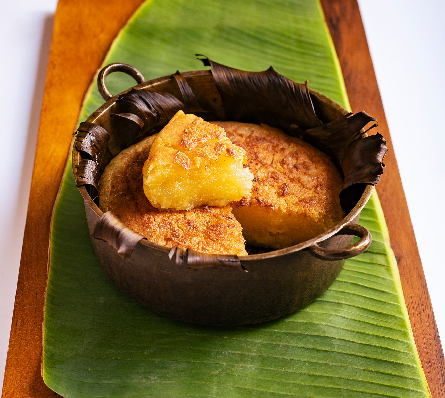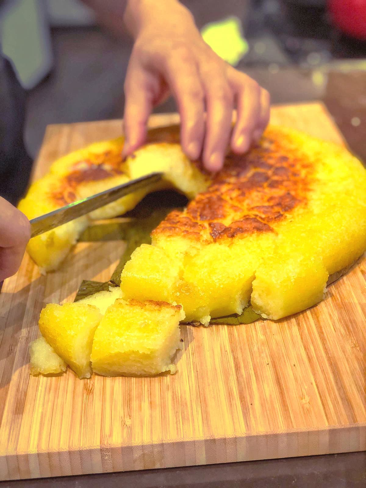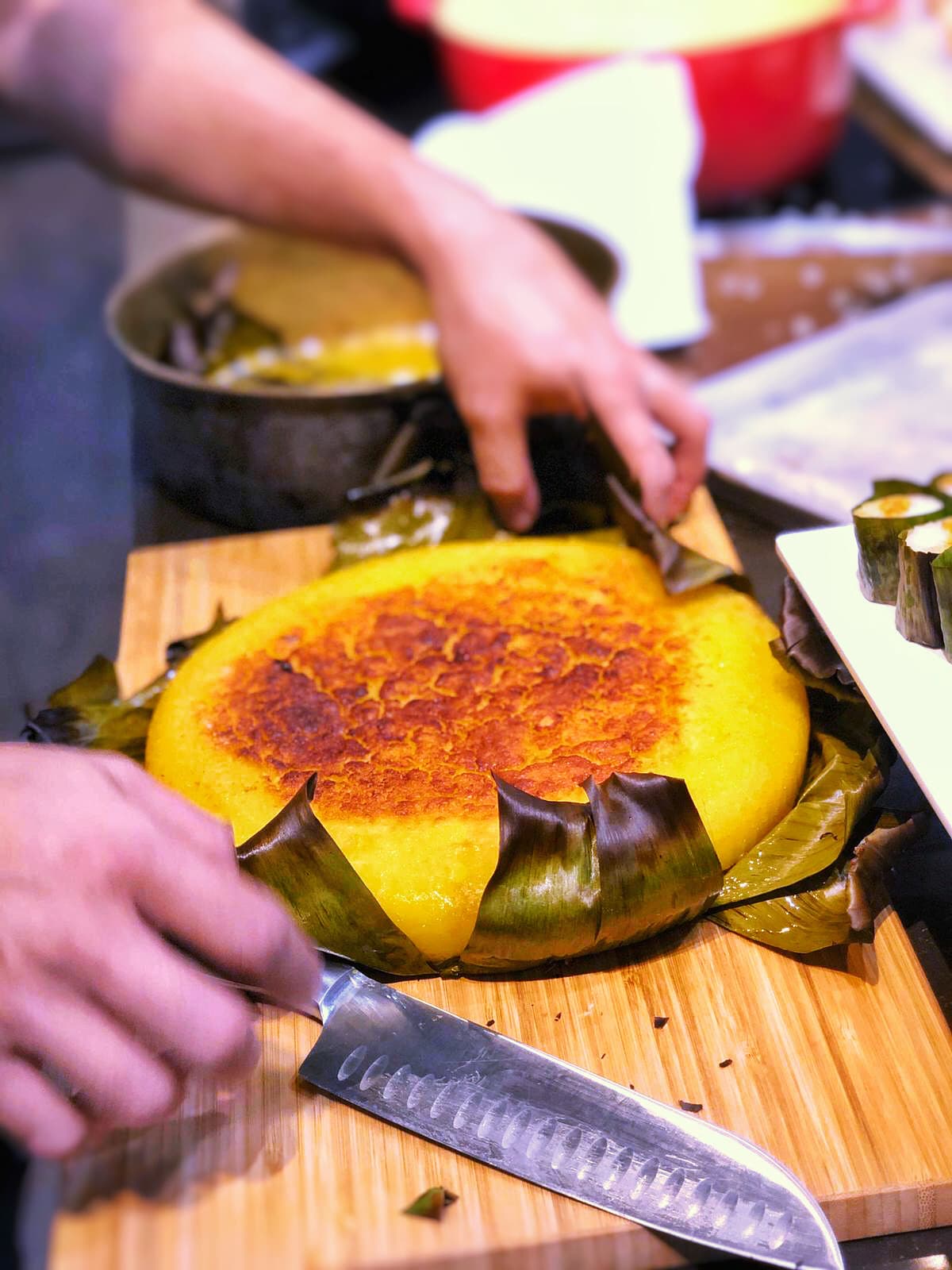 1. Preheat oven to 180C on conventional mode (top and bottom heat). Line the base and sides of a 20 cm square cake pan, at least 5 cm deep, with a large square of wilted banana leaf (no need to grease), shiny side up, tucking its corners to fit.