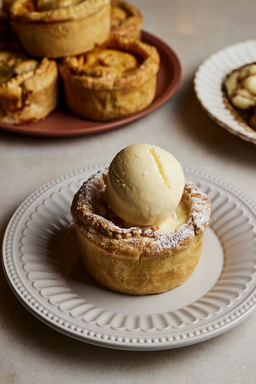 This is Neil’s take on the family-sized beef wellington pie, which he describes as a “cheeky take on a classic”. Instead of baking pastry-wrapped beef fillet sliced to serve, he stuffs an individual portion pie with slow-braised beef cheek in a mushroom cream reduction sauce.