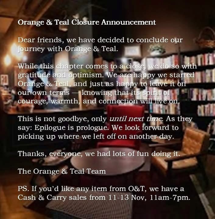 In a Facebook post on Tuesday morning (Nov 11), the cafe team wrote: "Dear friends, we have decided to conclude our journey with Orange & Teal.”