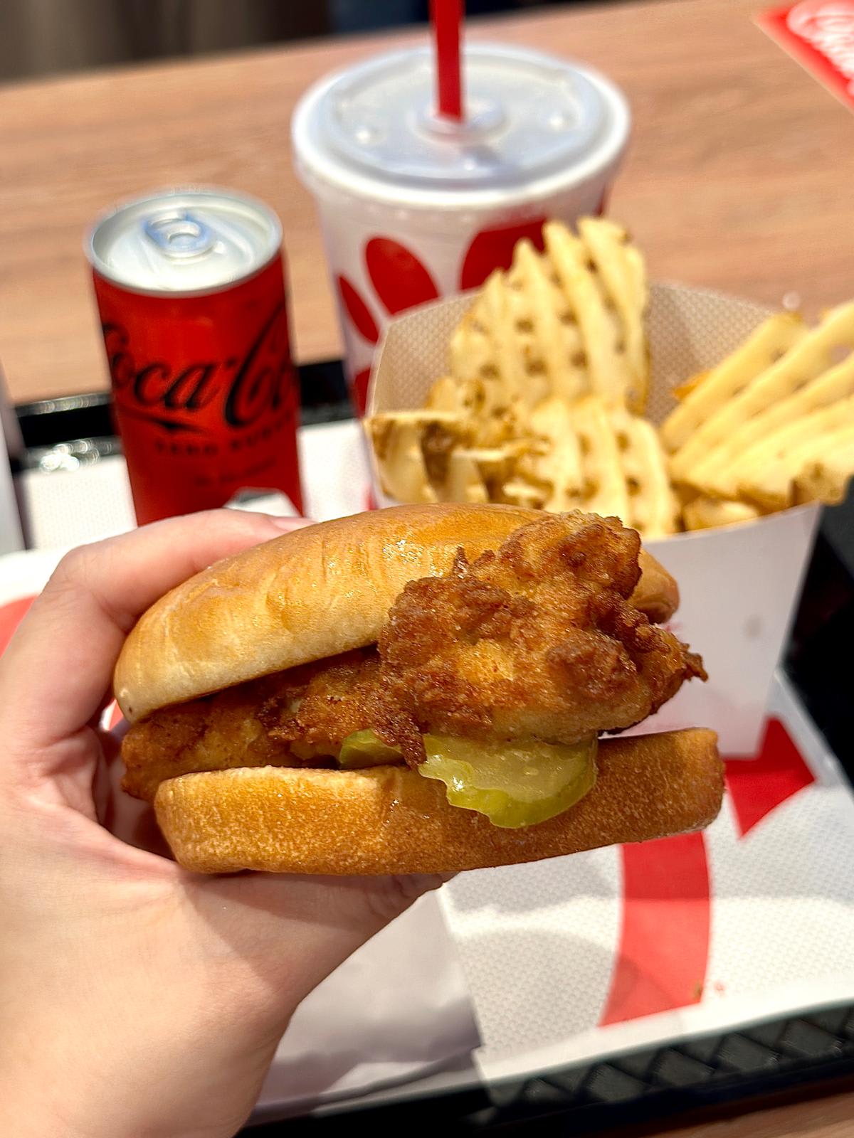 No decision fatigue here; the only choice you get here food-wise is a drink option of Coca-Cola (regular or diet) or bottled water. Otherwise, the pop-up offers just Chick-fil-A’s most well-known Original Chicken Sandwich, which is served with fried waffle potato fries.