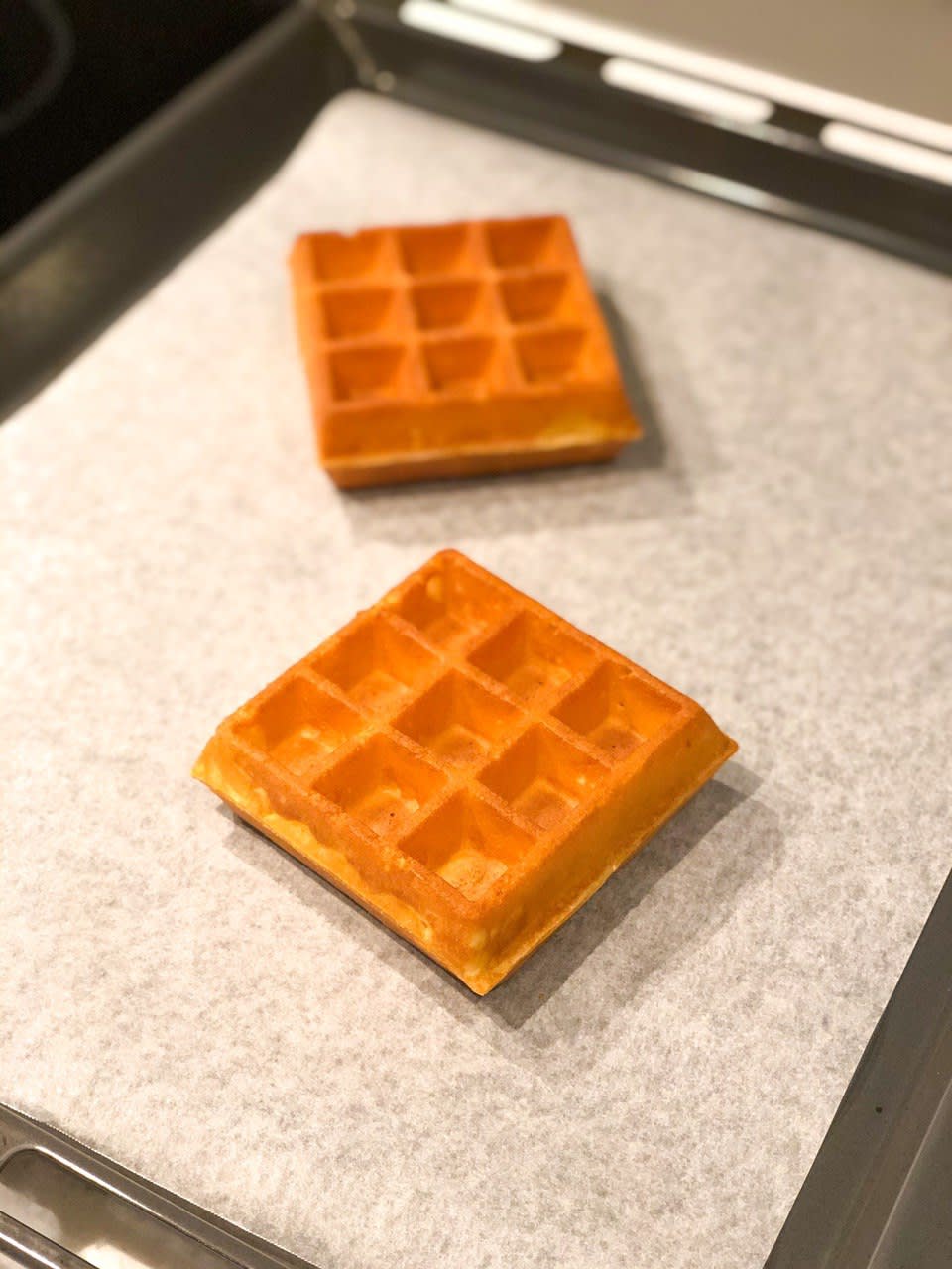 The stylish packet of four waffle squares costs $12, which works out to the same price as dining in-store ($6 per serving of two waffles at the café). Each parcel comes with clear heating instructions — there are options for using the toaster oven, pan on a stovetop, air-fryer, microwave oven or conventional oven. We chose the latter, with 12 minutes of baking in the oven.