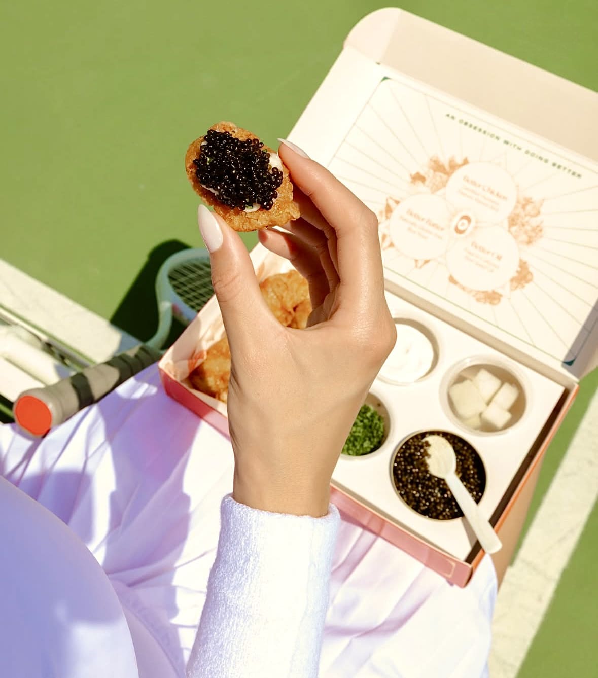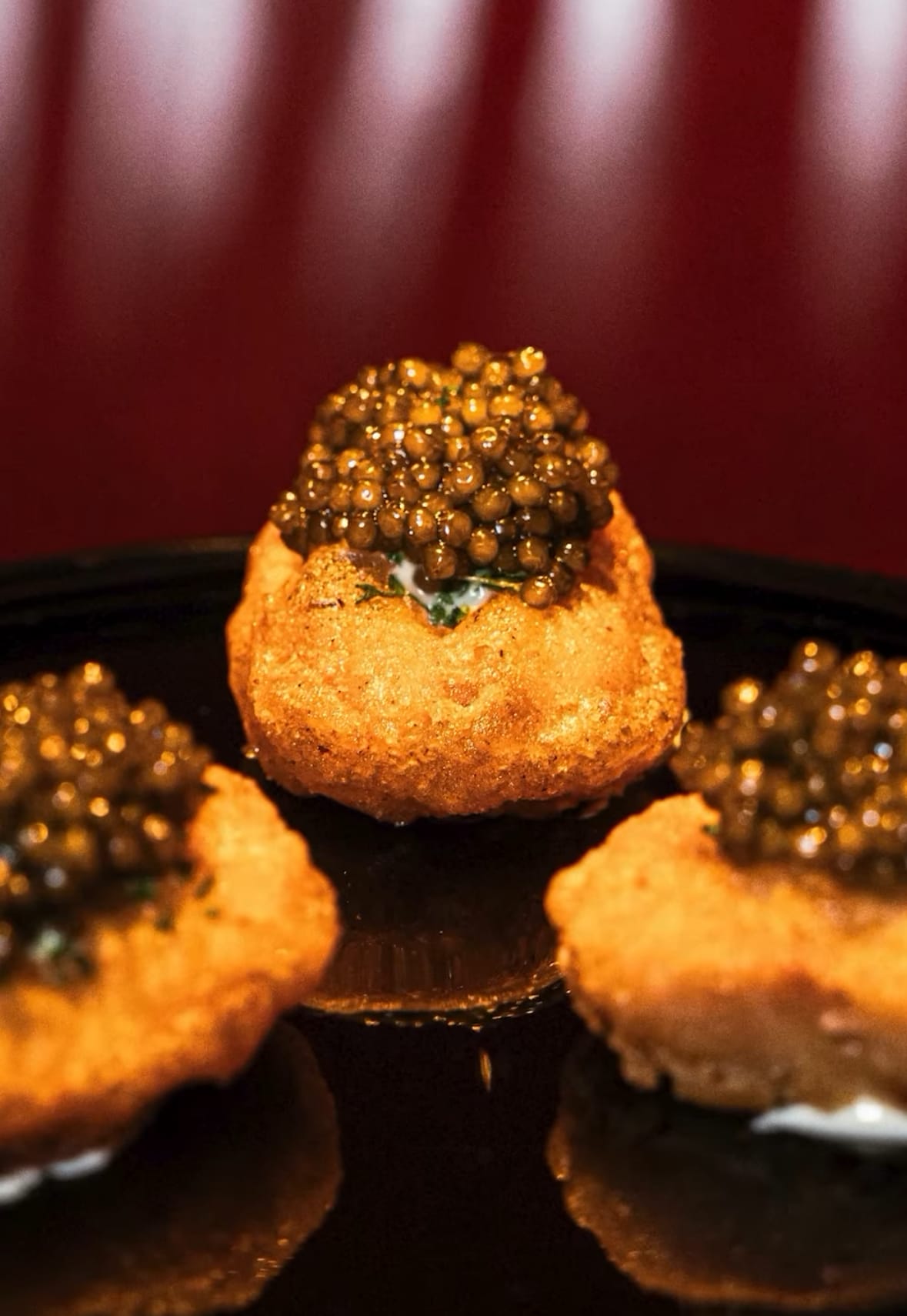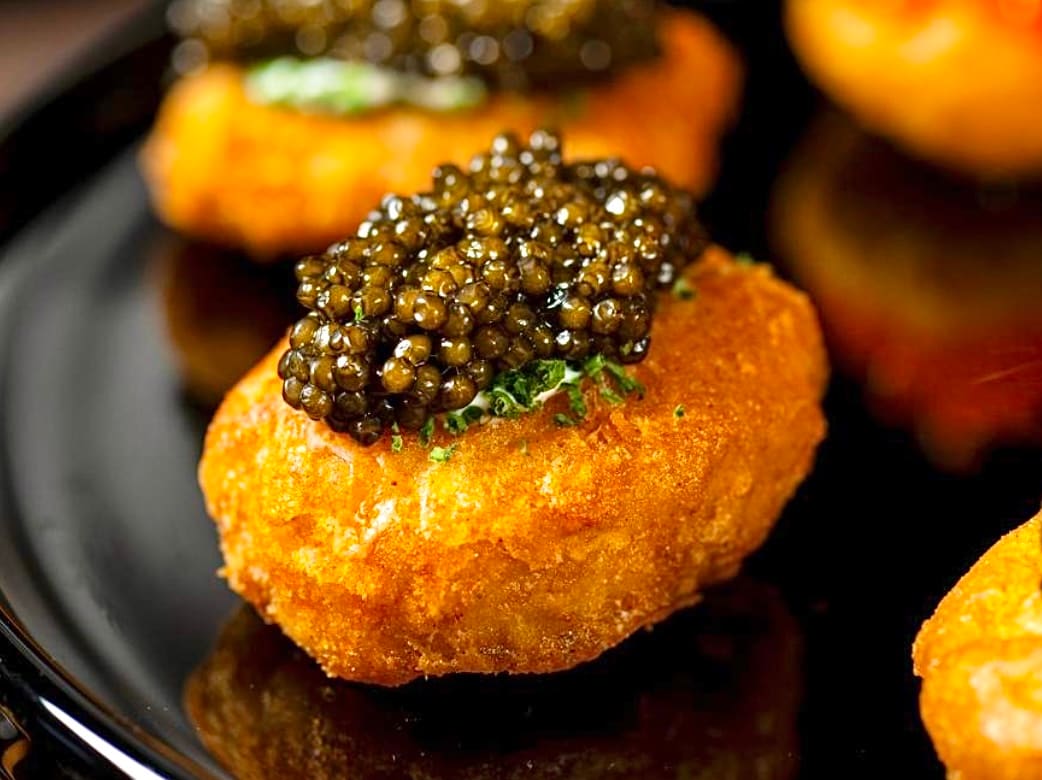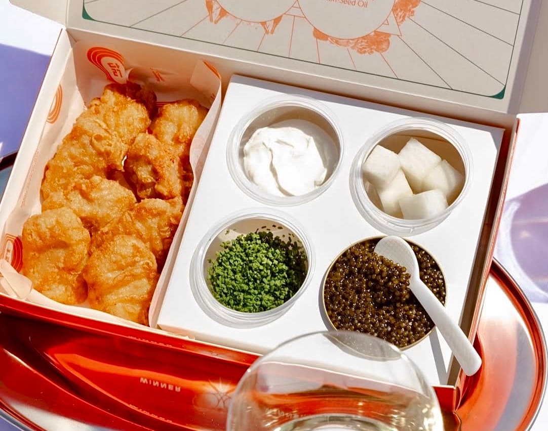 Think Korean chi-maek tradition (fried chicken and beer), but baller-style with caviar and champagne.