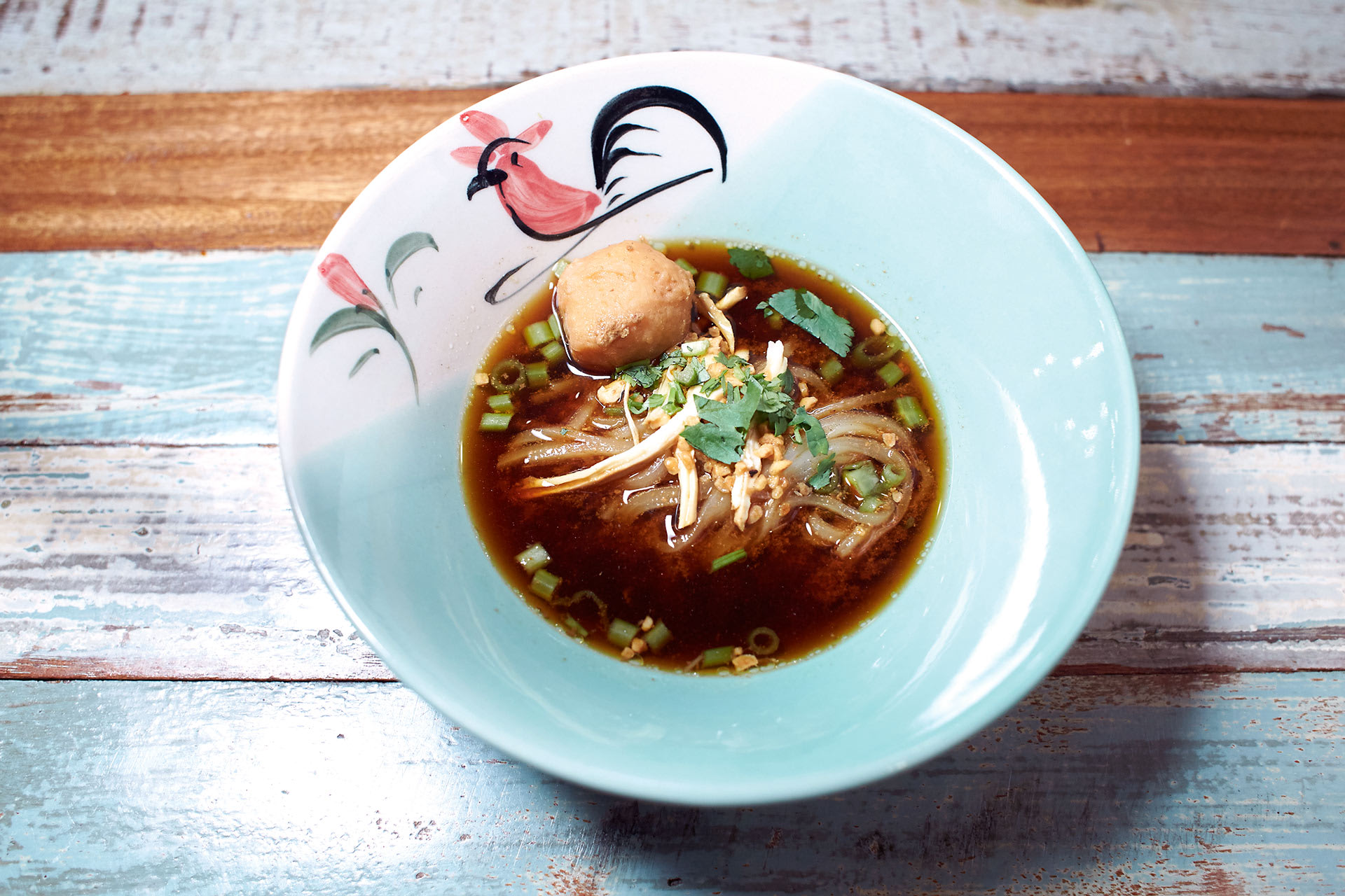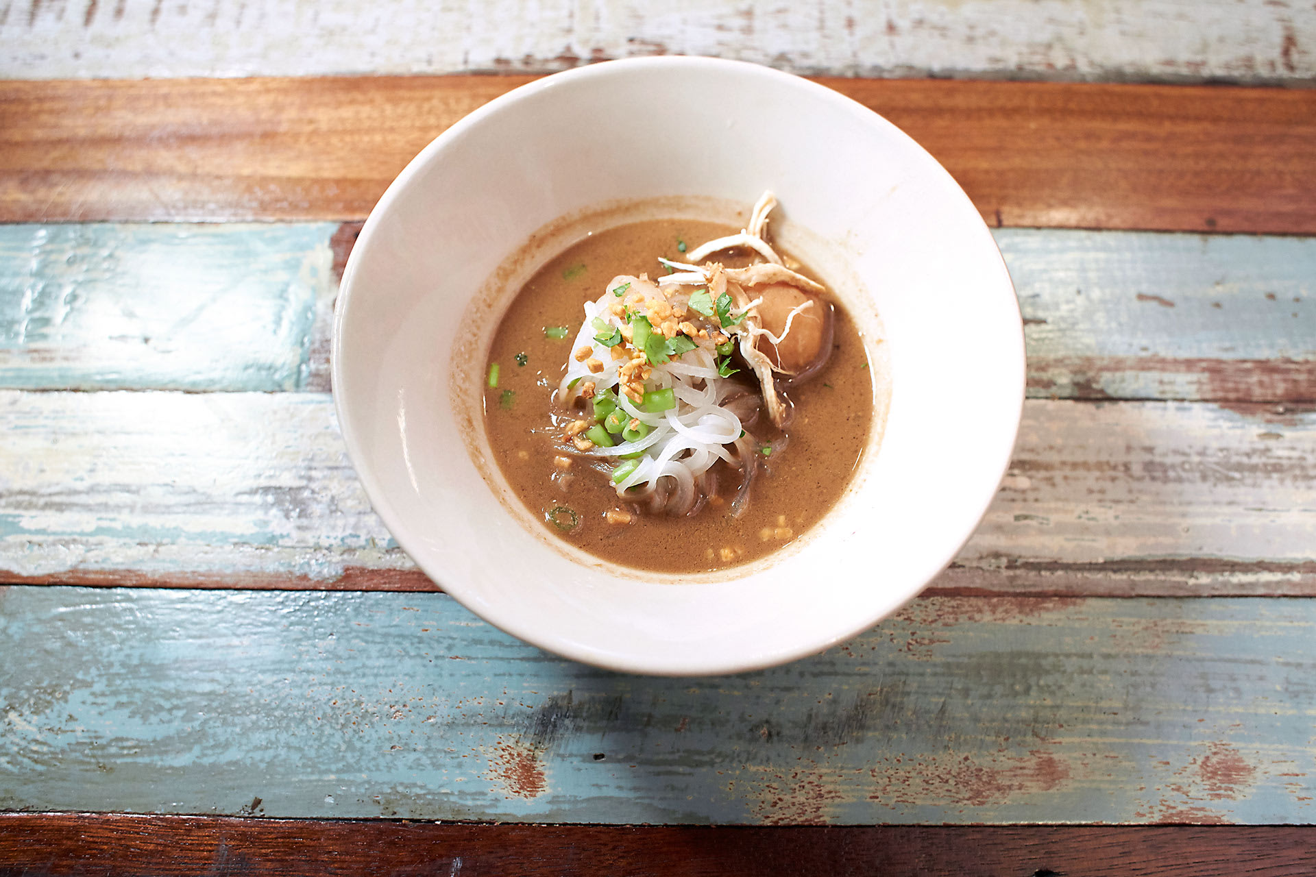 For the uninitiated, boat noodles, traditionally served from boats at the floating markets of Ayutthaya in Thailand, are tiny bowls of noodles in a strong pork or beef broth imbued with the animal’s blood. There are two types of (blood-free) broth served here: Pathumthani is a dark soy sauce chicken and beef broth and Ayutthaya is a coconut milk-spiked one.