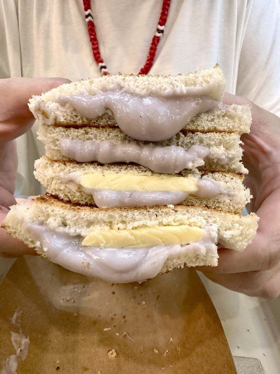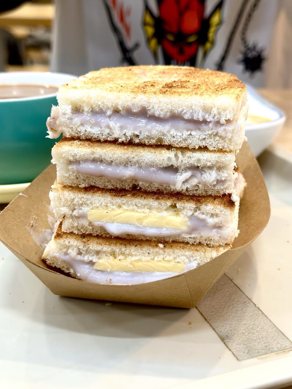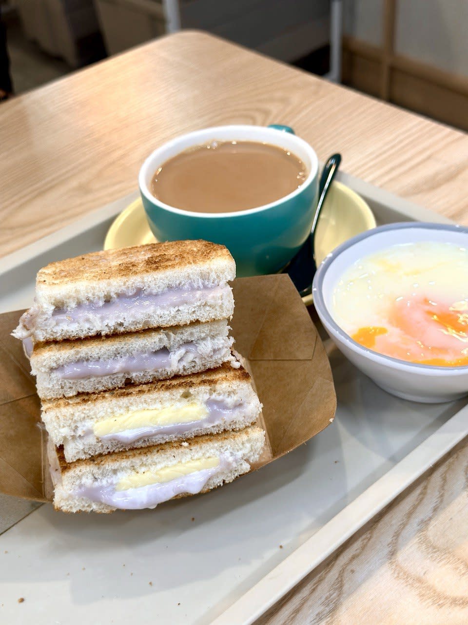 A local cafe put their own spin on the national breakfast, slathering the local staple toast with yam paste instead of eggy coconut jam.