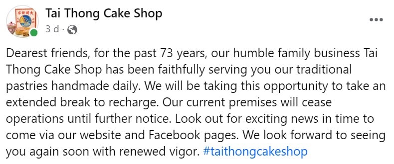 On Oct 11, Tai Thong shocked its regulars when it announced on social media that it was ceasing operations at their current premises “until further notice” and taking “an extended break to recharge.”