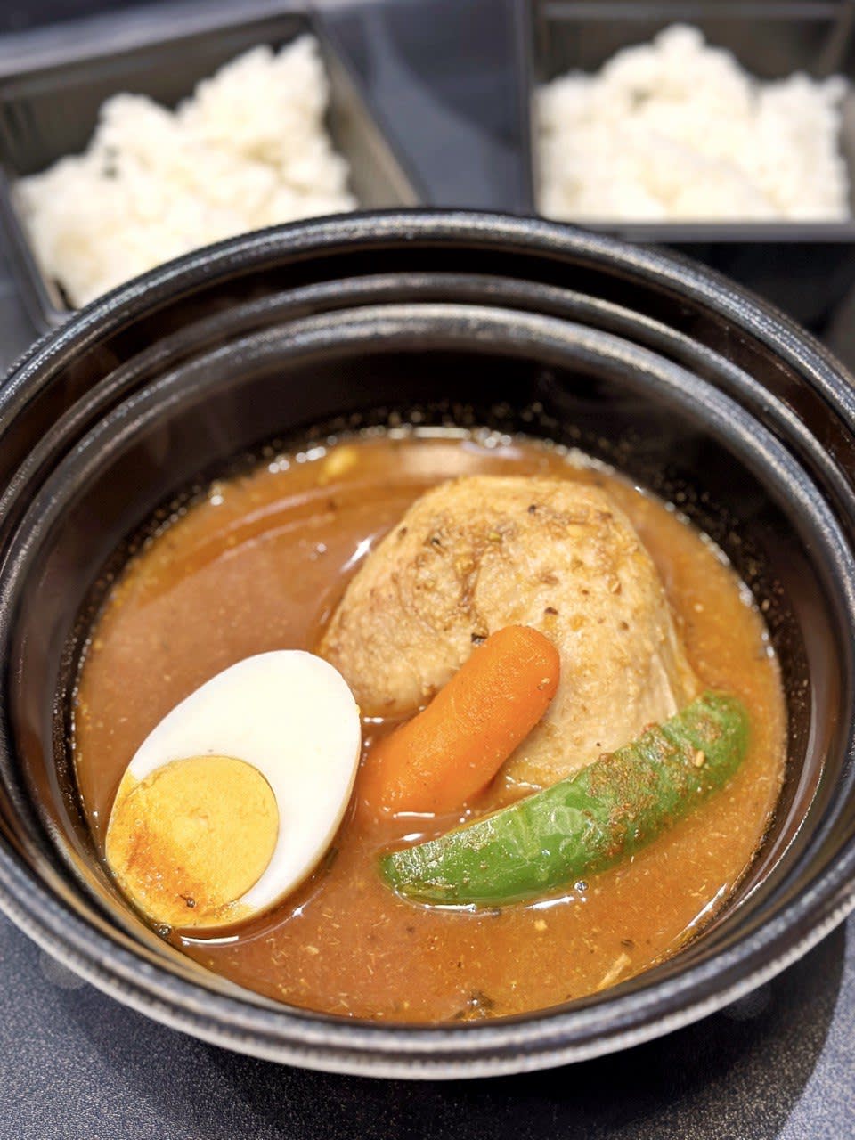 Rakkyo’s owner Go Ide, 55, is personally here to cook. We spotted him solemnly tasting each batch of curry he makes, which comes with a whole piece of tender chicken thigh, potato, sweet pea, carrot and half a hard-boiled egg. There is also the option of rice to go with your curry.