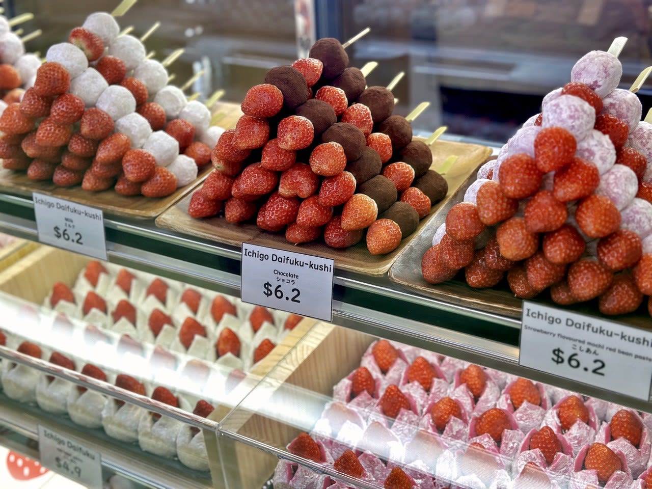 Pota Pota Ichigo is a famous daifuku shop from Sapporo. It specialises in Japanese mochi served two ways with strawberries. The fruit is either crowned on a split daifuku that resembles a tulip ($4.90 a piece), or skewered kushi-style with red bean paste daifukus ($6.20 a stick).
