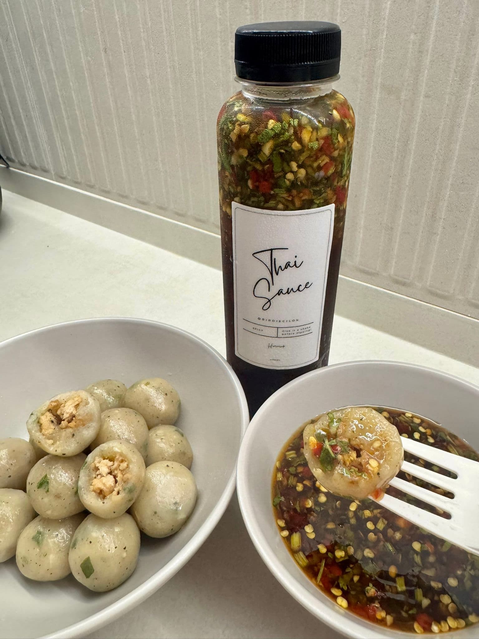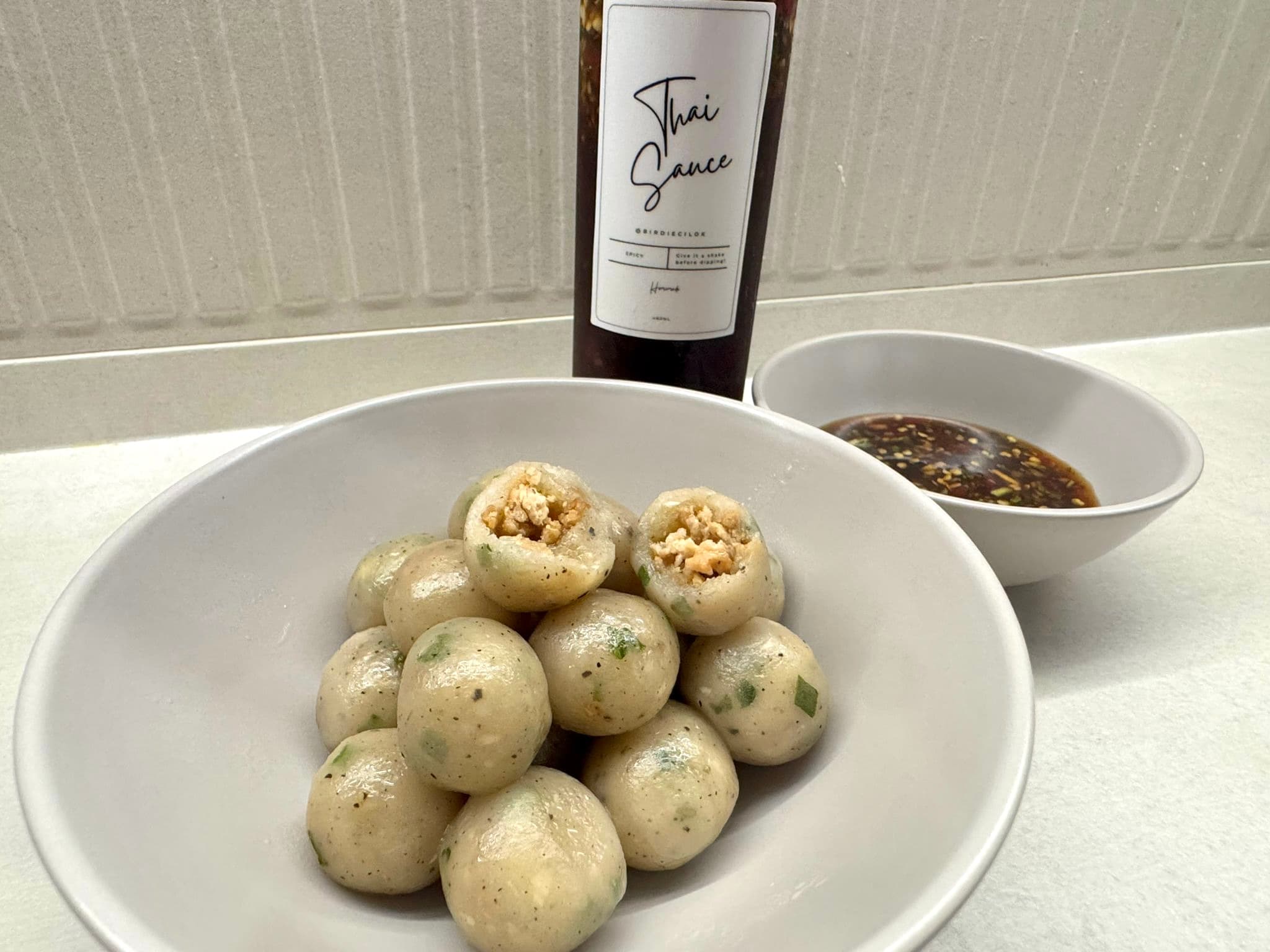 On weekends, the assistant infant care teacher sells Plain ($10 for 15 pcs) or Chicken ($13 for 15 pcs) cilok – the latter stuffed with minced chicken for extra bite. Every order comes with Syafiqah’s house-made Thai-style dipping sauce, a zesty mix of fish sauce, chilli padi and lime juice, which is also available for purchase separately.