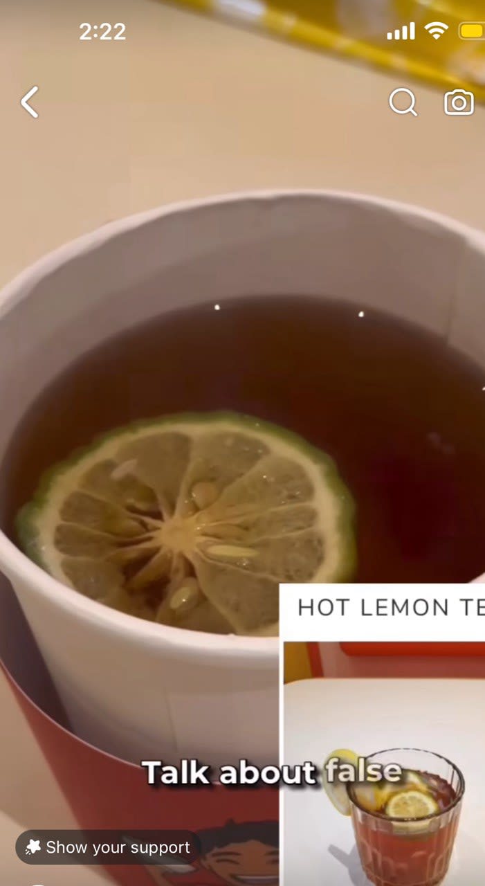Lukian observed that the orange cup that her lemon tea came in was “cute”, but had just one lemon slice compared to the several slices that was depicted in the menu photo. “Talk about false advertising,” she noted, adding that she “laughed it off at this point, but didn’t realise it was going to get much worse”.