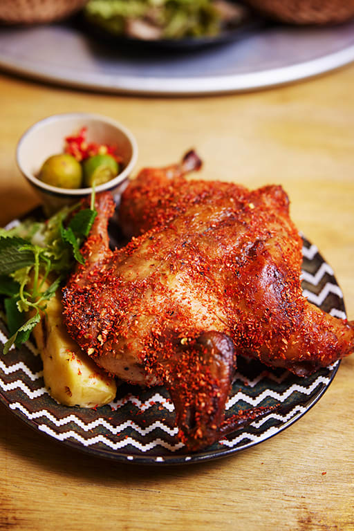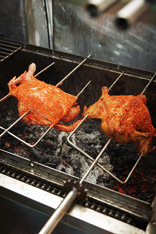 In Tuan’s kitchen is an automated barbecue pit where ducks and chickens grill on spits over charcoal. Our spicy chicken is rubbed with chilli flakes thrice, and rotated gently for about one and a half hours to get a smoky finish.