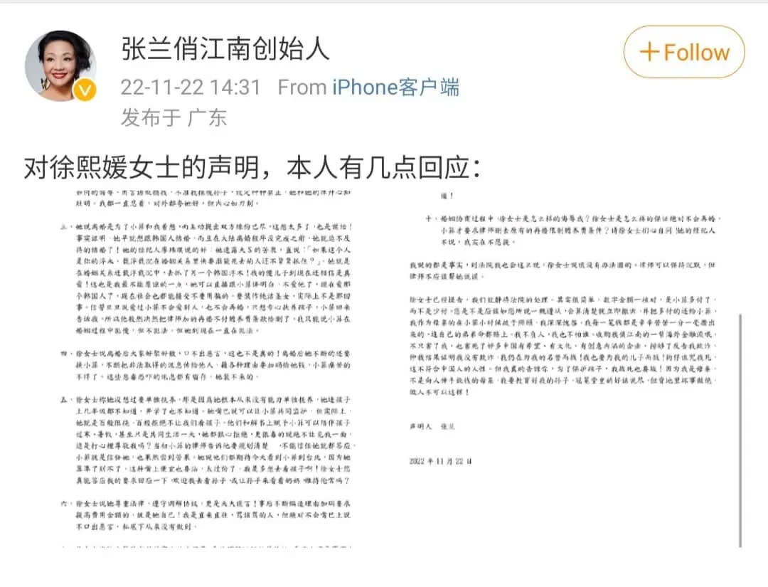 On Tuesday (Nov 22), Zhang Lan, 63, posted a statement on Weibo, accusing Barbie and her lawyers of resorting to threats to get the most out of the divorce, cheating on Xiaofei with her now-husband Korean rapper DJ Koo, 53, and trying to squeeze Xiaofei for more money post-divorce, among other things.