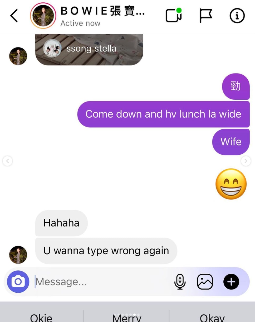 It seems that Benjamin Yuen has repeatedly been misspelling 'wife' as 'wide' when DM-ing his wife Bowie Cheung, thanks to a too small screen and too big thumbs.