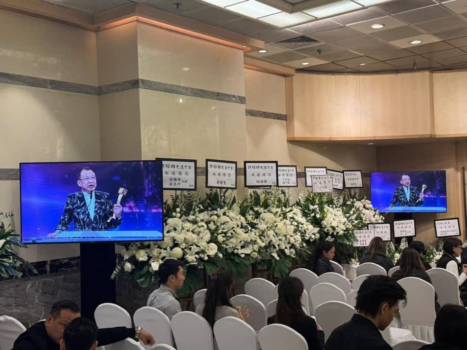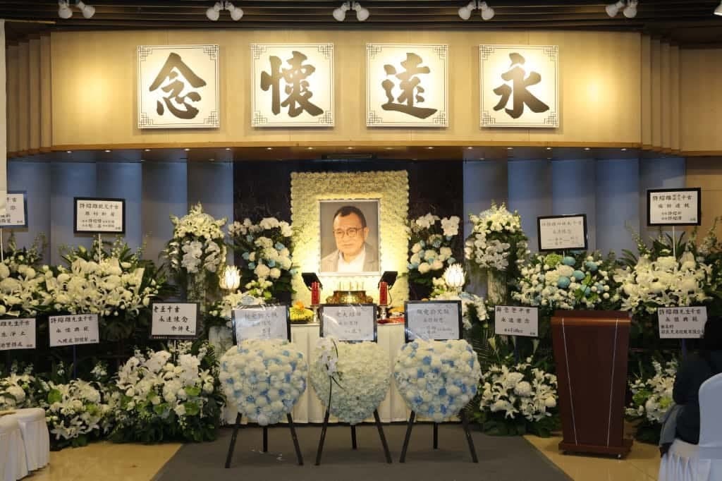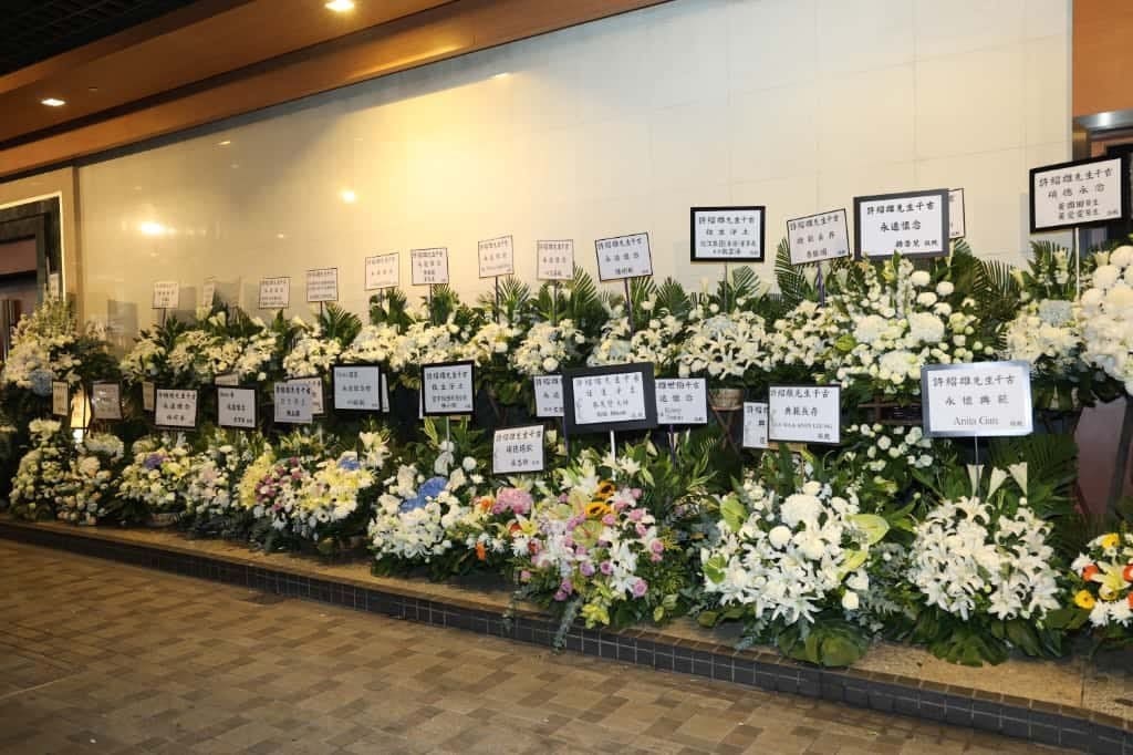 The ceremony was held at Tai Wai Pofook Memorial Hall, where the entrance was adorned with three photographs: the centre portrait of Benz, a shot of him in a white suit with a gentle smile on the left, and an iconic still of his beloved character Foon Hei Gor from TVB hit series The Line Walker on the right.